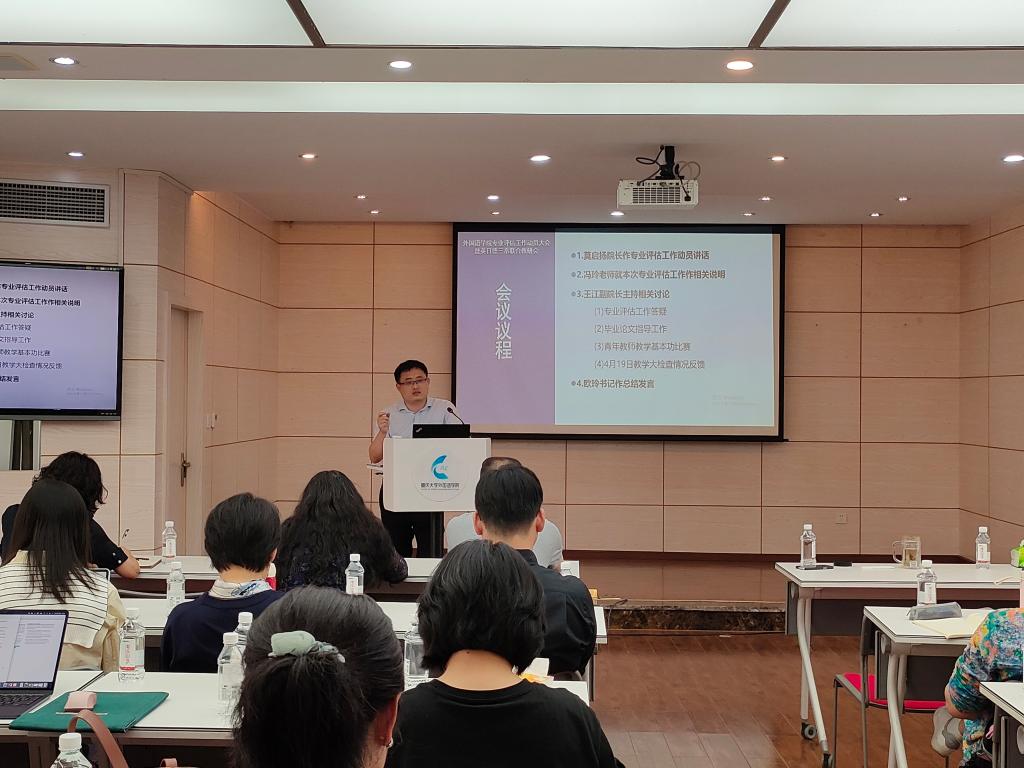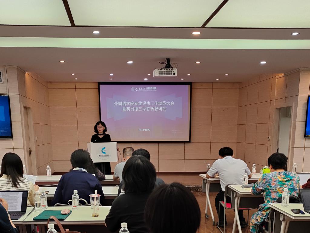 2023年4月20日,重庆大学外国语学院召开科专业评估工作动员大会,会议由王江副院长主持,欧玲书记、莫启扬院长和英日德三个专业系全体老师,以及教务办相关老师参加了本次会议。