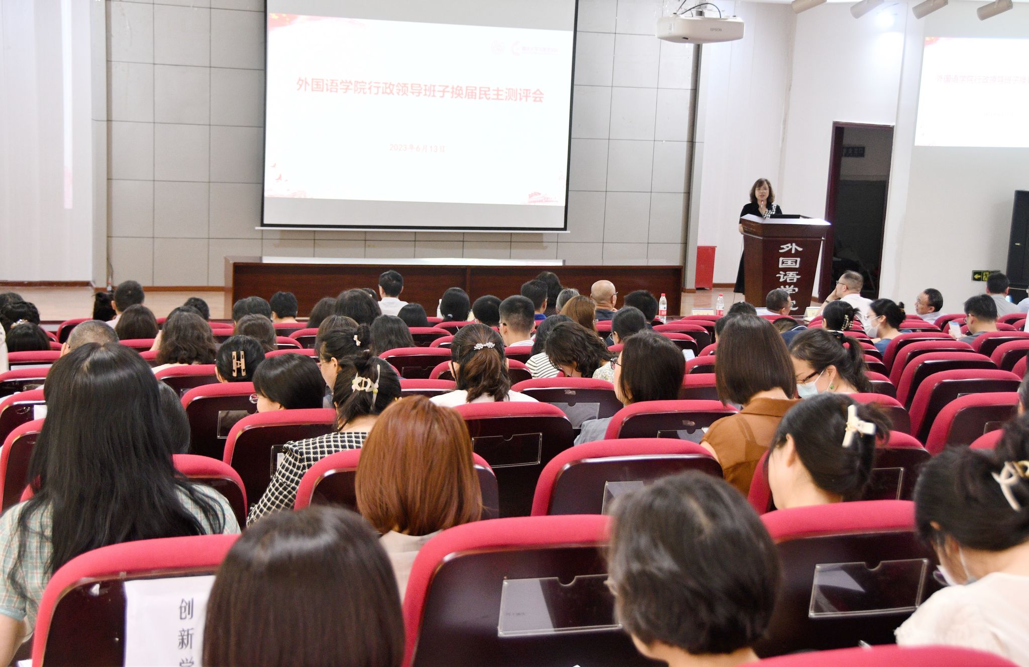 2023年6月13日下午,外国语学院在学院二楼多功能厅召开了全院教职工大会暨学院行政领导班子换届民主测评会议,党委巡视办主任何栎、机关党委正科级秘书姚猛出席会议,外国语学院党政领导班子及学院全体教职工参加了会议。会议由学院党委副书记、纪委书记魏世平主持,他首先介绍了学校考核组工作人员及会议主要议程,希望广大教职工本着对学院事业高度负责的态度,积极发挥群众监督作用。