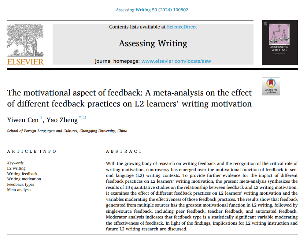 近期,我院郑尧老师与其指导的硕士研究生岑旖文在二语写作反馈与动机方面的研究工作取得新进展。相关成果在写作领域权威期刊Assessing Writing(SSCI语言学Q1;2022影响因子3.9;JCR排名13/195)上发表,论文题为“The motivational aspect of feedback: A meta-analysis on the effect of different feedback practices on L2 learners’writing motivation”。论文第一作者为我院2022级应用语言学专业硕士研究生岑旖文,通讯作者为郑尧老师。
