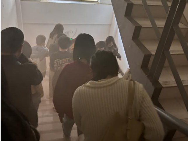 演练正式开始后,外国语学院楼5楼模拟出“浓烟滚滚”的火灾场景,消防疏散广播迅速响起,消防控制室报警主机也发出刺耳的警报声。在志愿者的有序引导下,楼内的师生们迅速采取行动,弯腰低身、捂住口鼻,沿着安全通道快速而有序地撤离现场。