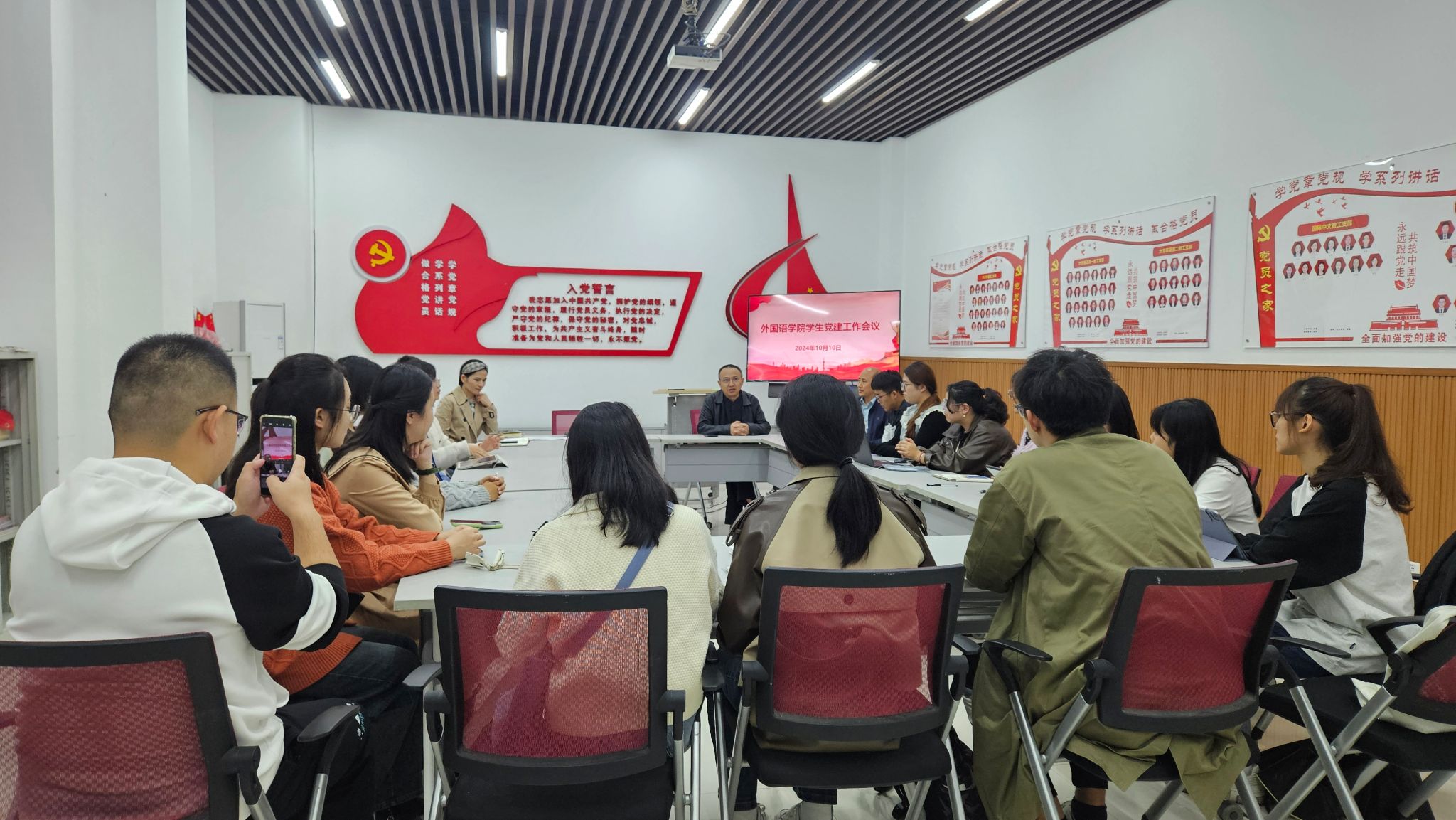 为进一步加强学生党建工作,2024年10月10日下午,外国语学院党委在外语学院楼105会议室召开了2024年第四次学生党建工作会议。会议由学院党委委员、组织员刘培老师主持,学院党委副书记、纪委书记魏世平老师,汉硕支部支部书记李良炎老师,学硕一支部支部书记朱洪召老师,本科生支部支部书记张茹老师,各学生支部书记、支委委员参加了会议。