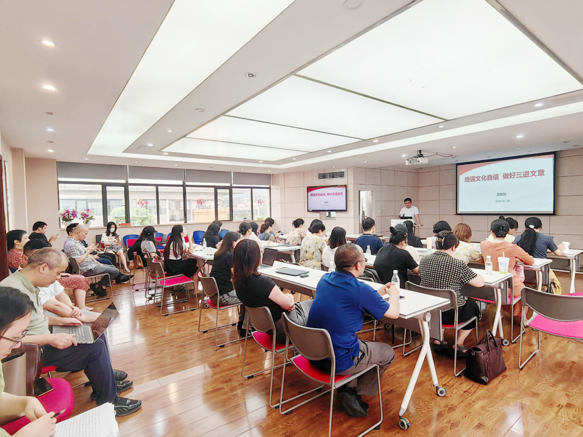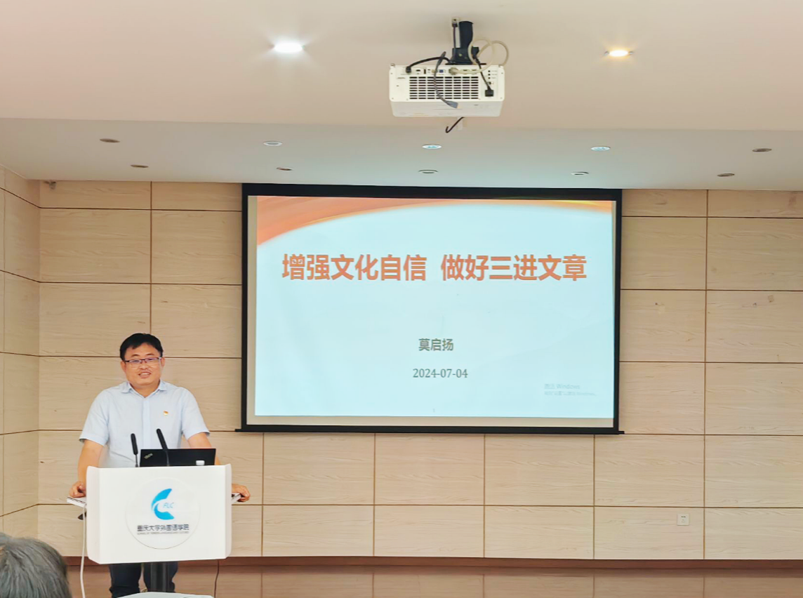 为了更好地探讨开展“三进”工作的新思路、新方法,2024年7月4日下午,外国语学院院长莫启扬教授在学院501会议室,以《增强文化自信,做好三进文章》为题,为外语专业教工党支部的全体成员讲了一场党课。此次活动还邀请了外国语学院党委书记欧玲以及英语系、日语系、德语系及基地的教师共同参加。活动由外语专业教工支部书记邓琪主持。