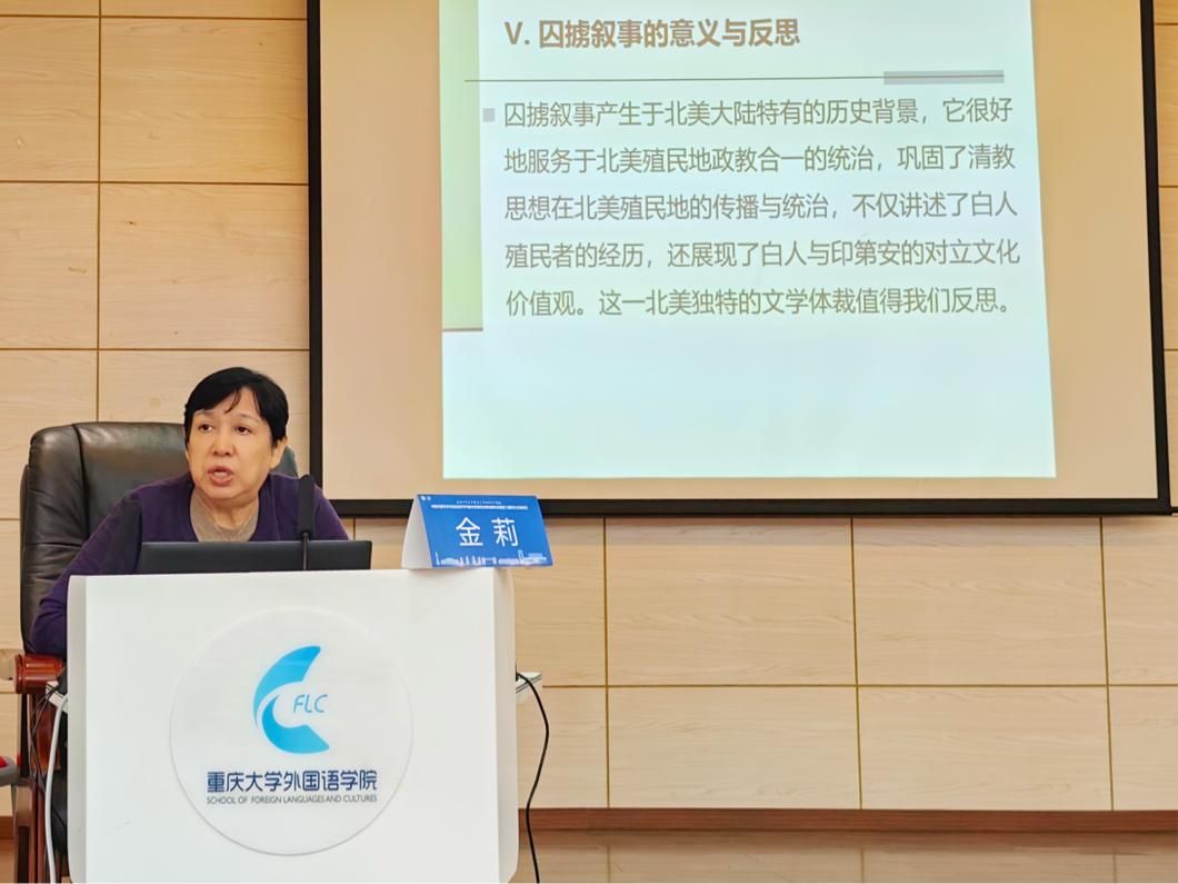 2024年11月8日下午,重庆大学人文大讲堂系列讲座--“囚掳叙事与美国种族话语建构”在重庆大学外国语学院501学术报告厅顺利举行。北京外国语大学原副校长、《外国文学》主编金莉教授应邀作了题为“囚掳叙事与美国种族话语建构”的讲座,校内外师生慕名而来,场内座无虚席。讲座由毛凌滢教授主持。