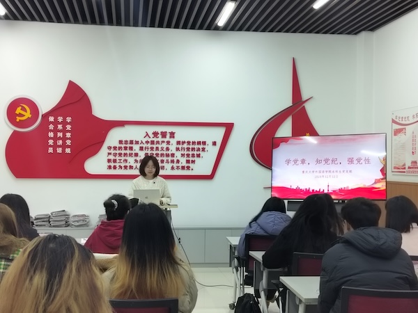 为了更好地学习领会二十大新党章的精神内涵,提升党员政治理论素养,增强党性修养,2024年12月12日下午,外国语学院本科生党支部举办了“学党章 知党纪 强党性”主题党日活动,组织支部党员集体学习了《中国共产党章程》。