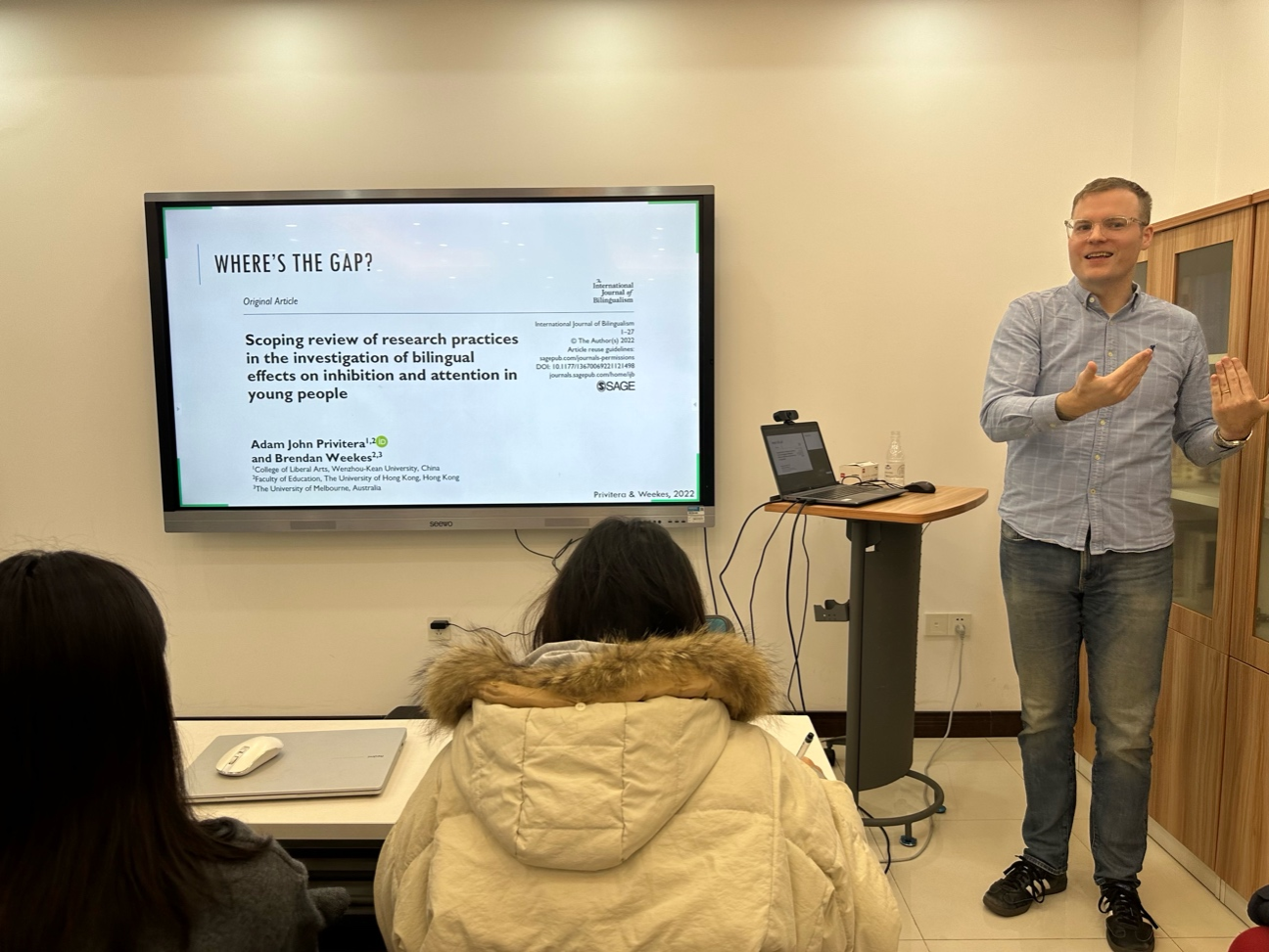 近日,新加坡南洋理工大学学习研究与发展中心研究员Adam John Privitera博士应邀为我院师生作题为“The Non-Linguistic Impact of Bilingualism: A Case for Foreign Language Study”的学术讲座。本次讲座受到学校国际合作交流处、国际学习中心、外国语学院的资助,是“典型发展人群和特殊人群的语言加工与语言学习研究”全球前沿系列讲座(G-Seminar)之一。本次讲座由语言科学与障碍实验室(公众号CQU语言科学与障碍)的康鑫教授主持,在重庆市人文社科重点研究基地“语言认知及语言应用研究基地”开展,吸引到众多校内外师生参与。