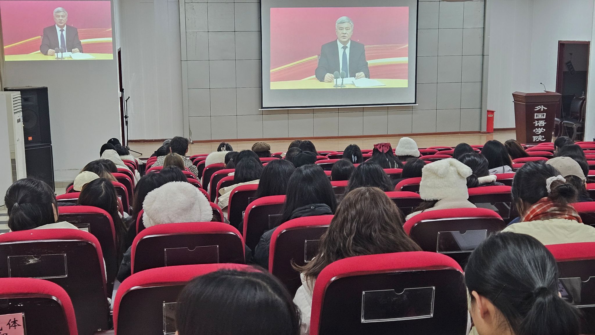 为进一步提升学院全体学生党员政治理论修养,加强对党的二十届三中全会精神的理解,2024年12月19日下午,外国语学院党委召开全体学生党员大会,集中学习中央党校(国家行政学院)副校长(副院长)谢春涛教授所作的《深入学习贯彻习近平总书记关于全面深化改革的一系列新思想、新观点、新论断和党的二十届三中全会精神》专题报告,学院党委委员、组织员刘培老师主持会议。
