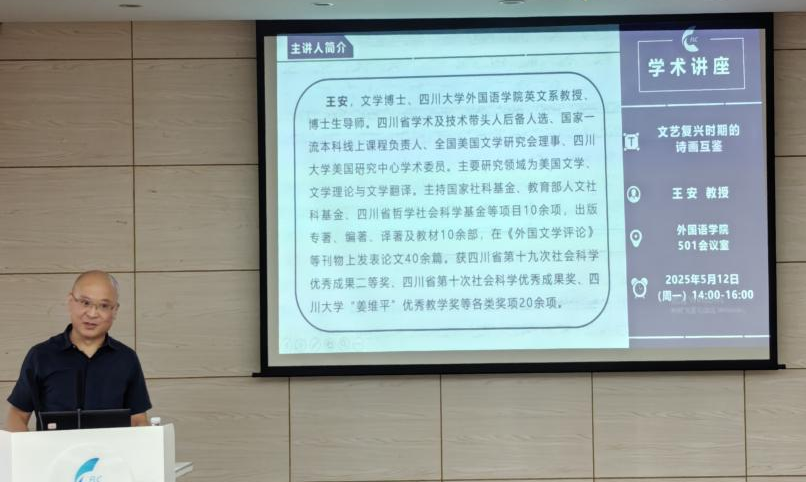 2025年5月12日下午,四川大学外国语学院王安教授在外国语学院楼501报告厅带来了一场题为“文艺复兴时期的诗画互鉴” 的精彩讲座。讲座由毛凌滢教授主持,吸引了众多师生参与。
