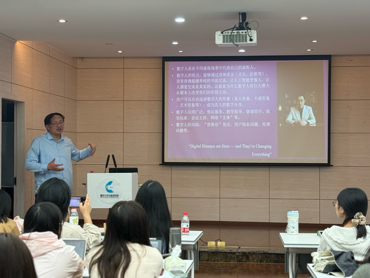 张翼教授就当前人工智能的应用、人工智能与情感“共情”、数字人和人工智能在语言研究中的应用这四个方面进行分享。在讲座中,张教授通过考察人工智能共情能力的技术发展与教育场景应用之间的关联,探讨了AI时代人类情感互动与教学模式的变革机制。在讲座中,张教授结合实验数据与技术案例,细致地讲解了AI共情的认知、情感与动机三个层次,指出需要注意AI技术应用中的道德与伦理问题。在对数字人的讨论中,张翼教授通过NAO机器人与Replika数字人等典型案例展开,深入探讨了AI情感模拟的伦理风险与社会影响。他指出,AI通过算法模拟的情感互动,不仅改变了传统的人际交流方式,还可能引发隐私泄露、算法操控与人际能力退化等深层问题。