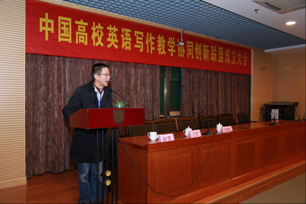 2013年11月30日上午9点,“中国高校英语写作教学协同创新联盟”(以下简称“写作联盟”)在南京大学成立。教育部大学外语教学指导委员会主任委员王守仁教授、全国高等学校大学外语教学研究会会长杨治中教授参加本次会议并致辞。清华大学、北京大学、南京大学、复旦大学、中山大学等52所高校的80余位专家教授齐聚一堂,共同搭建全国英语写作教学研究的协同共享机制,专家教授们高度认可该联盟的成立,对联盟的使命和今后的组织管理以及推动教学的具体工作进行了热烈的讨论。我校外国语学院余渭深书记、欧玲副院长出席成立大会,余渭生教授在大会上做总结性发言。