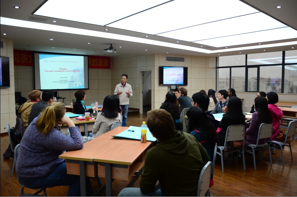 2013年11月21日下午,外国语学院邀请余渭深教授作为英语教学专家做了第一次中外教师共同参加的英语课堂教学研讨。研讨会开始之前,欧玲副院长强调组织此类活动的目的不是要求所有课堂教学趋同,学院鼓励教师有个性化的课堂,但无论怎样的课堂都需要有理念的建立,理论的支撑,语言教师需要一定的专业训练。对课堂教学的反思可以帮助语言教师的职业发展,提高其教学技能以及职业素养。学院还将邀请有经验的外籍教师来做此类的教学研讨,共同探讨增强课堂教学有效性的方法和途径。