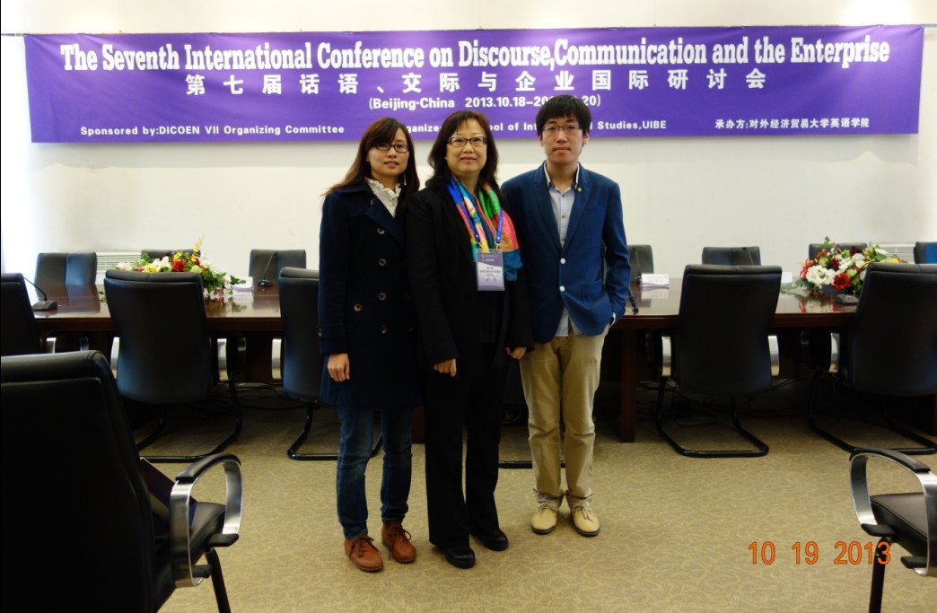 我院黄赟琳副教授带领硕士研究生许寅、李森参加了由对外经贸大学于2013年10月19-20日举行的“第七届话语、交际与企业国际研讨会”(The Seventh International Conference on Discourse, Communication and Enterprise VII , DICOEN VII)。本届大会首次在中国大陆举办,来自美国、英国、德国、意大利、澳大利亚、挪威、日本、新加坡、马来西亚共计九个国家以及香港、台湾地区、中国大陆的近70名专家学者参加了本次会议。