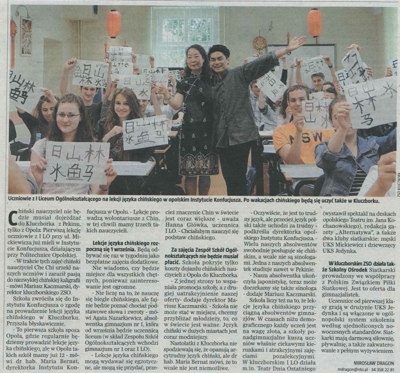 2013年5月20日,我院2012级汉语国际教育研究生车驰,作为国家汉办海外志愿者,为波兰奥波莱省克卢奇堡市第一高中的学生们进行了一次令人难忘的书法讲座,其中包括汉字从甲骨文到楷书的演变,并带领学生亲自体验毛笔书法。