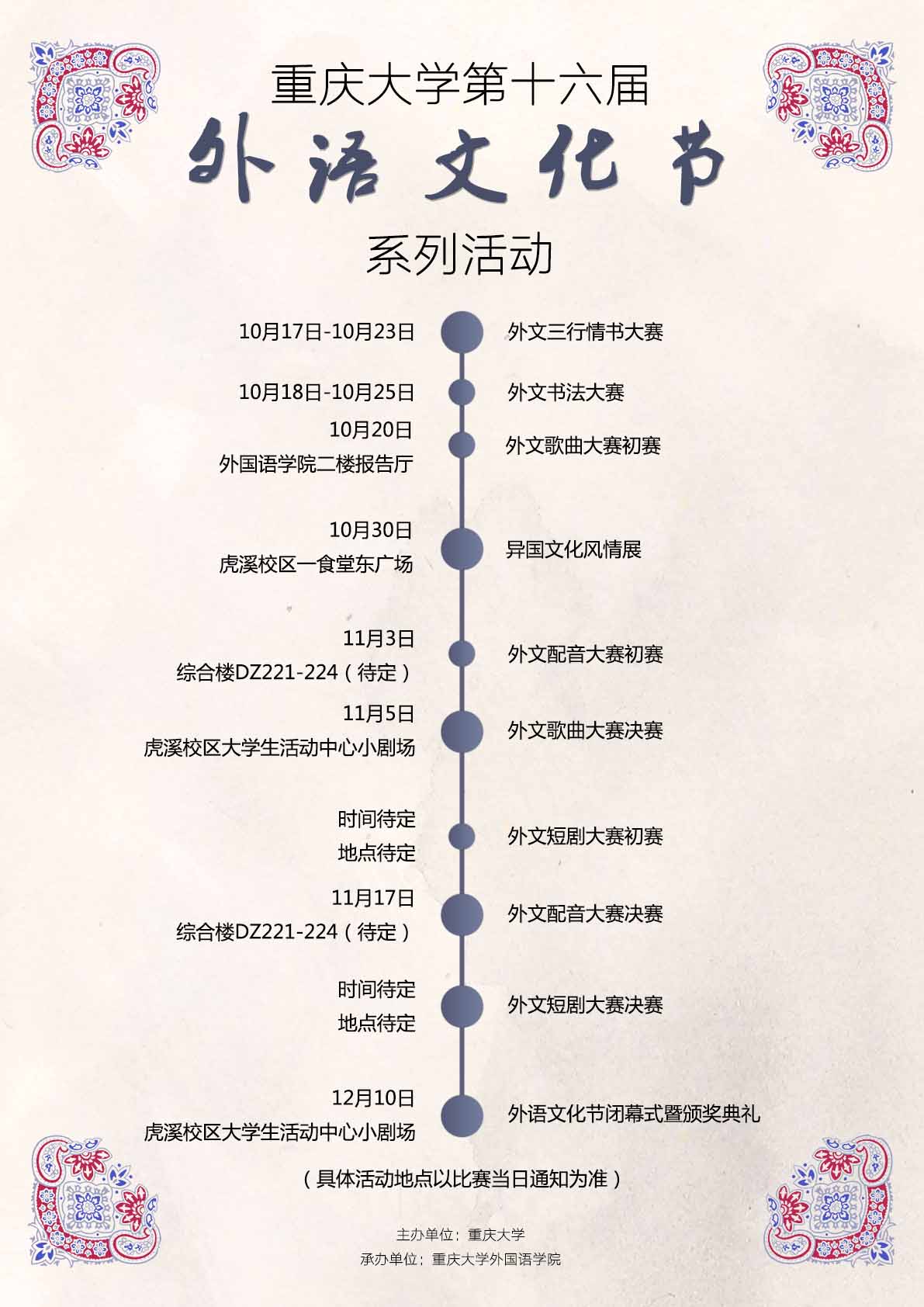 重庆大学第十六届外语文化节定于10月中旬至12月10日举行,在两个月的时间里,本届外语文化节会举办多个活动,内容丰富、形式多样、受众广泛。具体的活动安排如下: