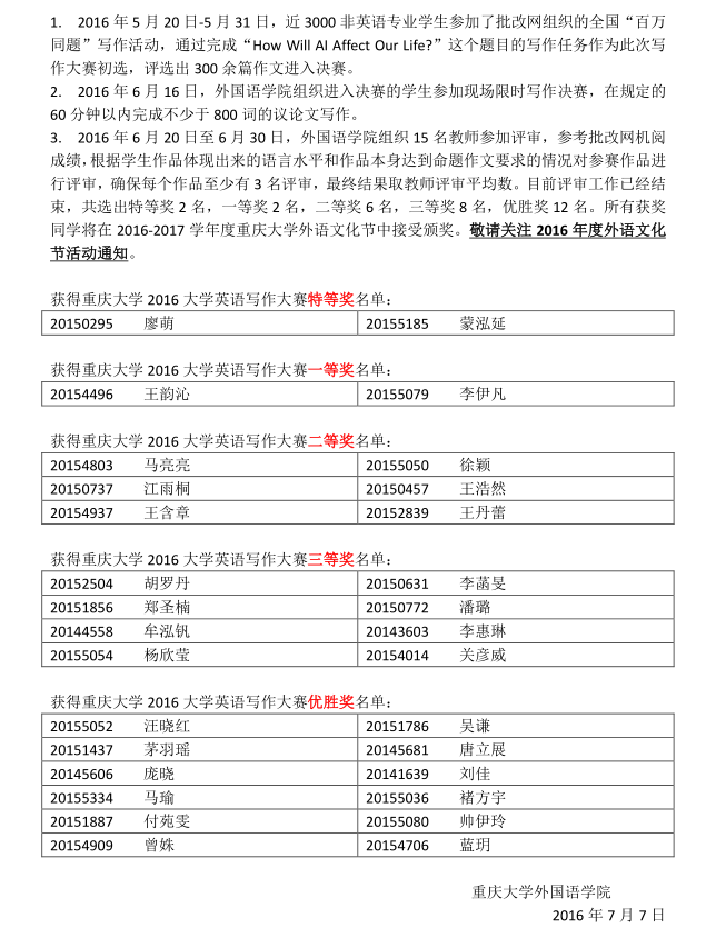 重庆大学2016年大学英语写作及阅读大赛揭晓
