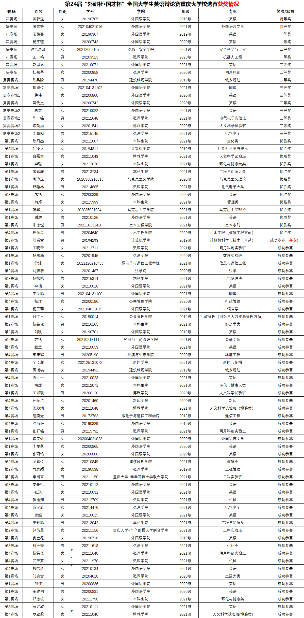 2022年3月27日,第24届“外研社•国才杯”全国大学生英语辩论赛重庆大学校园选拔赛在腾讯会议线上平台顺利举办。本次大赛共吸引全校25个学院66个专业的64支队伍参赛,最终评选出2名特等奖、2名一等奖、4名二等奖、8名三等奖、13名优胜奖。详细获奖情况如下: