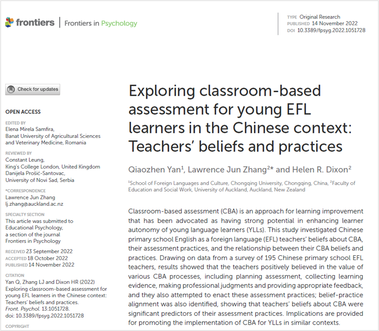近日,我院英语系讲师颜巧珍博士与新西兰奥克兰大学Lawrence Jun Zhang和Helen Dixon教授合作,在国际知名期刊Frontiers in Psychology(SSCI一区)发表学术论文Exploring classroom-based assessment for young EFL learners in the Chinese context: Teachers’ beliefs and practices。该论文是中央高校基本科研业务费项目(《中国英语能力等级量表》在义务教育阶段英语促学评价中的应用研究)(项目编号:2022CDJSKJC03)的成果之一。