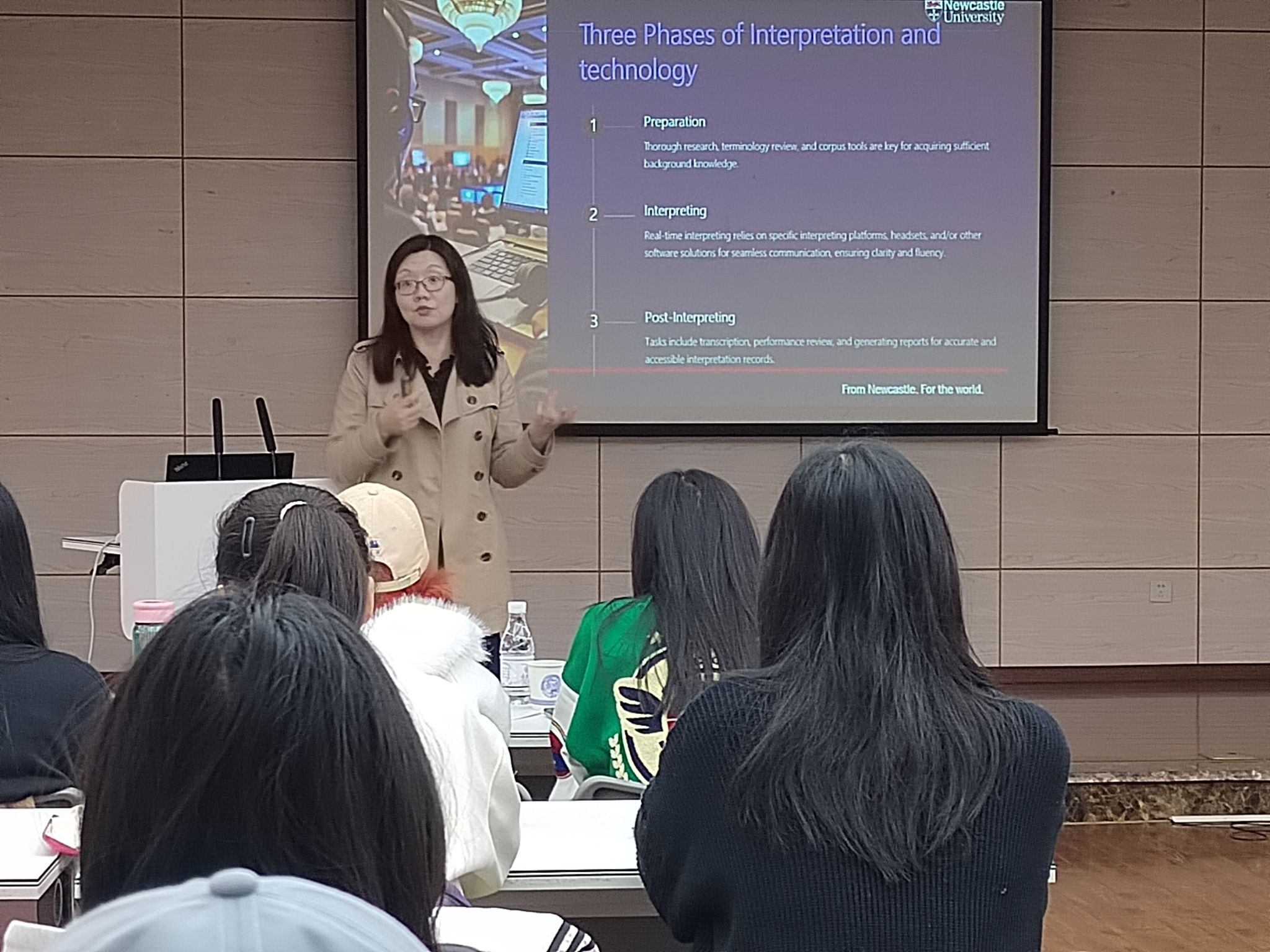 2025年3月21日重庆大学虎溪校区外国语学院楼501教室迎来了一场前沿学术讲座。本次讲座由纽卡斯尔大学硕士课程主任,博士生导师Yalta Chen和口笔译课程主任Phoebe Yu主讲,翻译硕士教育中心晏生宏主任主持。讲座聚焦于人工智能(AI)在口译和翻译/本地化行业中的变革性影响。
