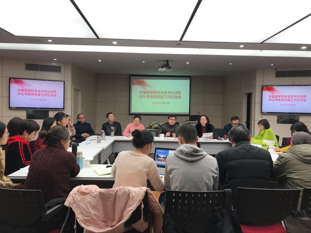 2018年12月29日上午,外国语学院党委在学院501报告厅召开了党支部书记述职评议考核暨党建工作交流会。会议由学院党委书记欧玲主持,院党委委员、纪委书记、纪委委员、各教工党支部书记、支委委员,各学生党支部书记参加了会议。