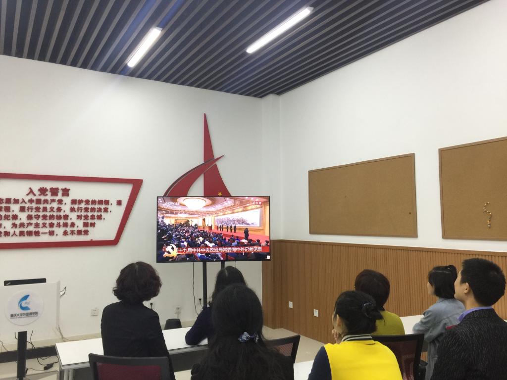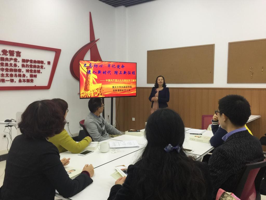 10月25日下午,外国语学院105党建室,创新课程组党支部举行了“深入学习十九大报告精神”的主题党日活动。支部全体党员首先收看了“十九届中共中央政治局常委同中外记者见面”现场直播。随后,同志们又深入学习了“十九大报告精神”。十九大报告分为十三个部分: 一、过去五年的工作和历史性变革;二、新时代中国共产党的历史使命;三、新时代中国特色社会主义思想和基本方略;四、决胜全面建成小康社会,开启全面建设社会主义现代化国家新征程;五、贯彻新发展理念,建设现代化经济体系;六、健全人民当家作主制度体系,发展社会主义民主政治;七、坚定文化自信,推动社会主义文化繁荣兴盛;八、提高保障和改善民生水平,加强和创新社会治理;九、加快生态文明体制改革,建设美丽中国;十、坚持走中国特色强军之路,全面推进国防和军队现代化;十一、坚持“一国两制”,推进祖国统一;十二、坚持和平发展道路,推动构建人类命运共同体;十三、坚定不移全面从严治党,不断提高党的执政能力和领导水平。报告的主题是:不忘初心,牢记使命,高举中国特色社会主义旗帜,决胜全面建成小康社会,夺取新时代中国特色社会主义伟大胜利,为实现中华民族伟大胜利,为实现中华民族伟大复兴的中国梦不懈奋斗。习近平总书记强调:不忘初心,方得始终。中国共产党人的初心和使命,就是为中国人民谋幸福,为中华民族谋复兴。这个初心和使命是激励中国共产党人不断前进的根本动力。全党同志一定要永远与人民同呼吸、共命运、心连心,永远把人民对美好生活的向往作为奋斗目标,以永不懈怠的精神状态和一往无前的奋斗姿态,继续朝着实现中华民族伟大复兴的宏伟目标奋勇前进。同志们就报告的各部分内容进行了热烈的讨论并发表了自己的看法。其中余渭深教授指出:二十一世纪是中国迅速崛起的世纪。我国的发展有一种大国气质,能融合各民族的多元文化,复兴我们的传统文化,提升文化自信。二十一世纪就是中国的时代等。