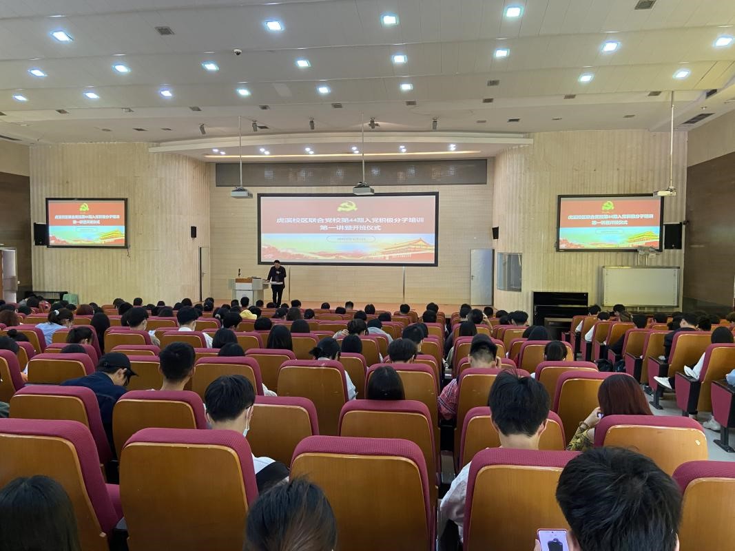 为深入学习贯彻习近平新时代中国特色社会主义思想,切实增强入党积极分子培训的系统性和规范性,进一步提高入党积极分子培训的质量和水平,2022年4月7日下午,虎溪校区联合党校第44期入党积极分子培训开班仪式暨课堂教学第一讲在综合楼Z126报告厅隆重举行,来自虎溪党工委、化学化工学院党委、物理学院党委、数学与统计学院党委、外国语学院党委、大数据与软件学院党委、药学院党委等7个党组织的416名学员参加了此次培训。开班仪式由大数据与软件学院党委书记文俊浩主持,虎溪党工委书记吴丙山、外国语学院党委书记欧玲、物理学院党委书记韩忠、化学化工学院党委书记刘仁龙、药学院党委书记凌明、大数据与软件学院党委副书记萧倩同志出席了开班仪式。