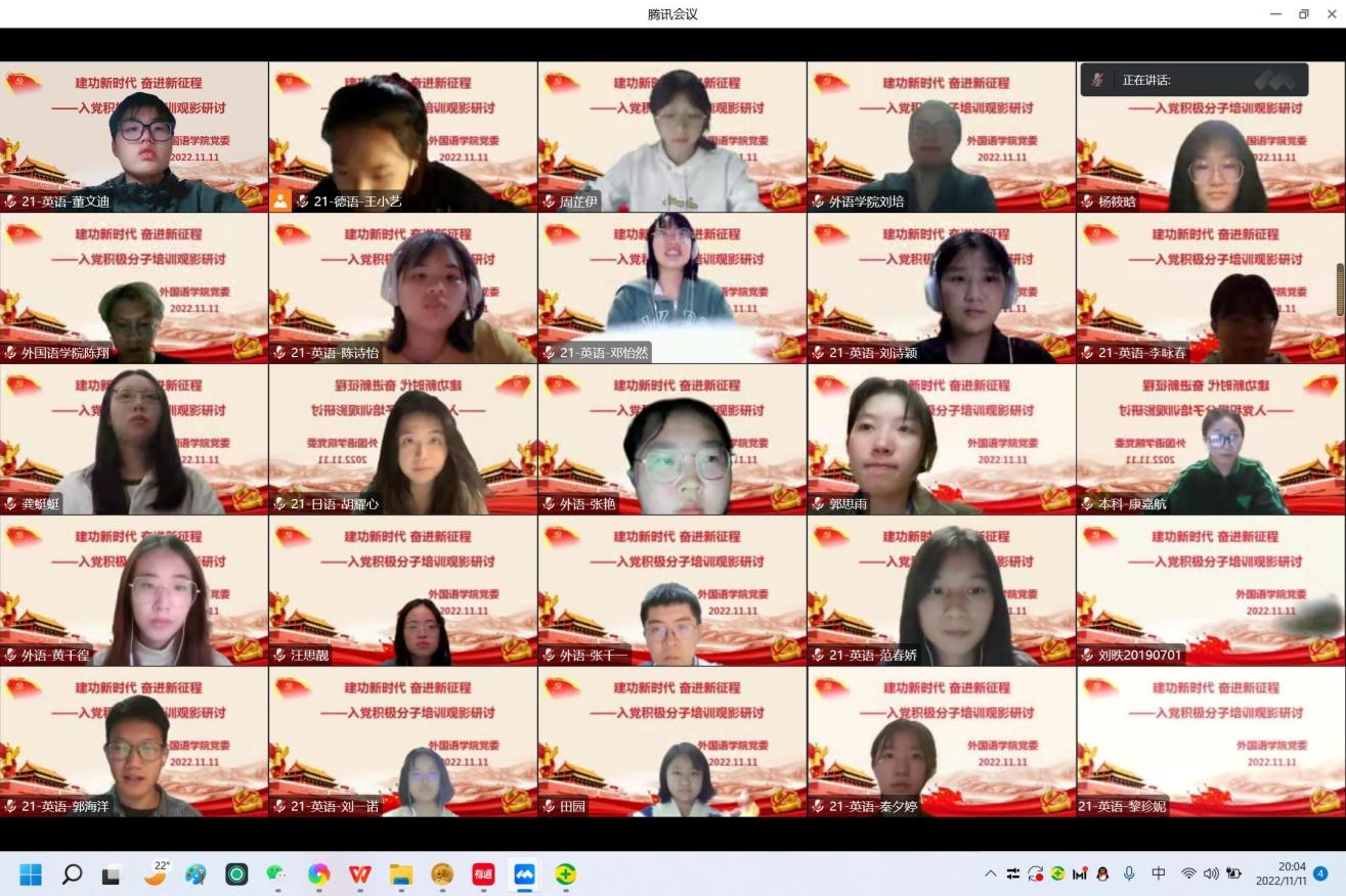 为深入学习和贯彻党的二十大精神、习近平新时代中国特色社会主义思想,提高入党积极分子的政治理论素养和思想觉悟,扎实做好入党积极分子培训工作,2022年11月11日晚上7点,外国语学院党委在线举行了“建功新时代 奋进新征程”——入党积极分子培训观影心得交流会。会议由来自2021级德语专业的王小艺同学主持,学院党委委员、组织员刘培老师及各位学员参加了会议。