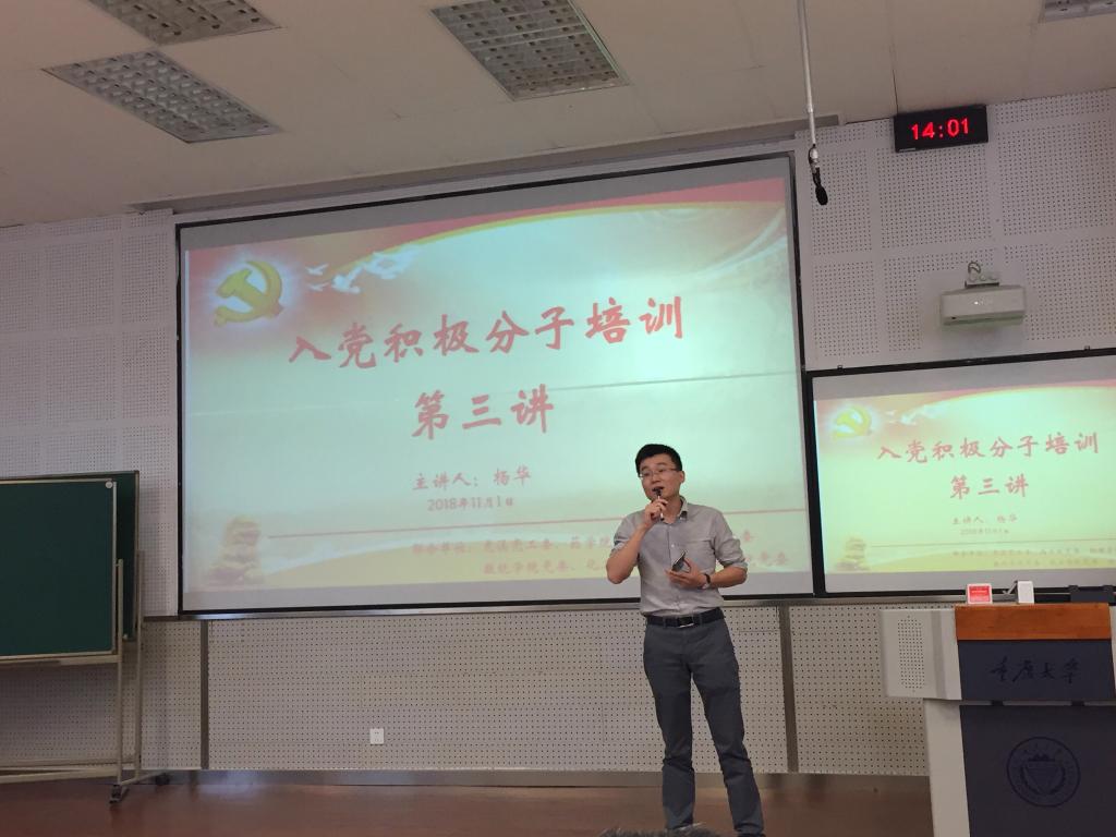 2018年11月1日下午2:00,由外国语学院党委、虎溪校区党工委、药学院党委、数统学院党委、化工学院党委、物理学院党委联合党校组织的第37期入党积极分子培训第三讲在一教137教室进行。此次培训由药学院组织员曹全兴老师主持。