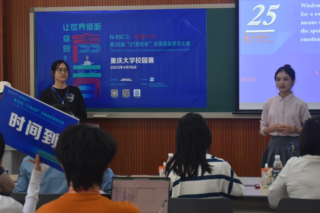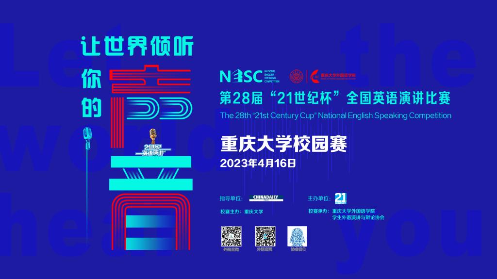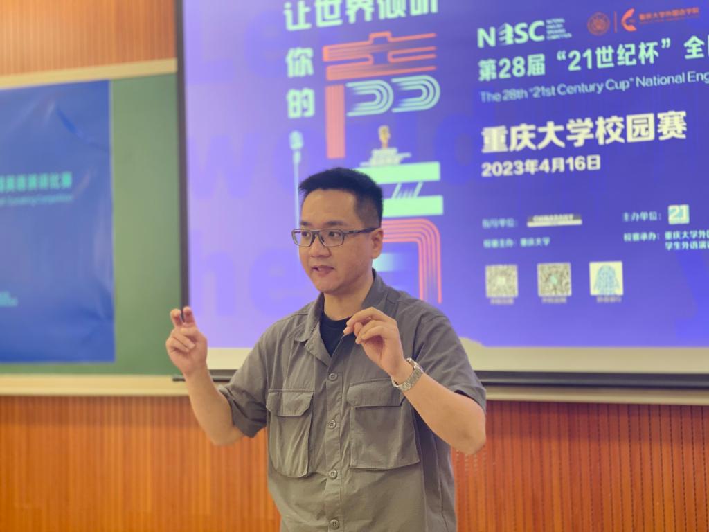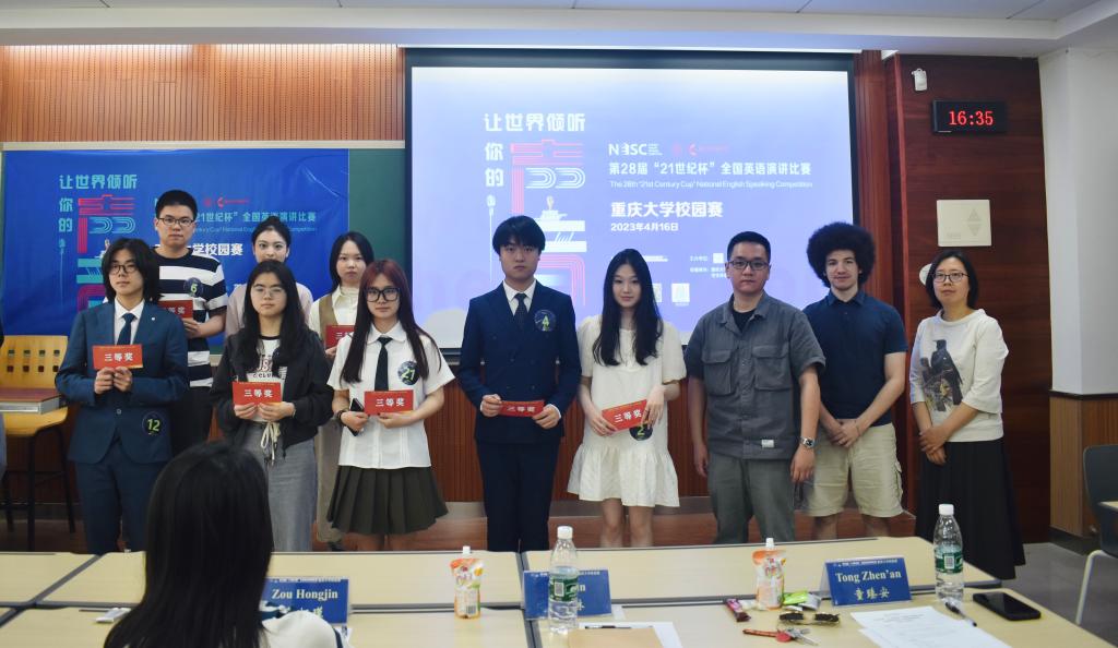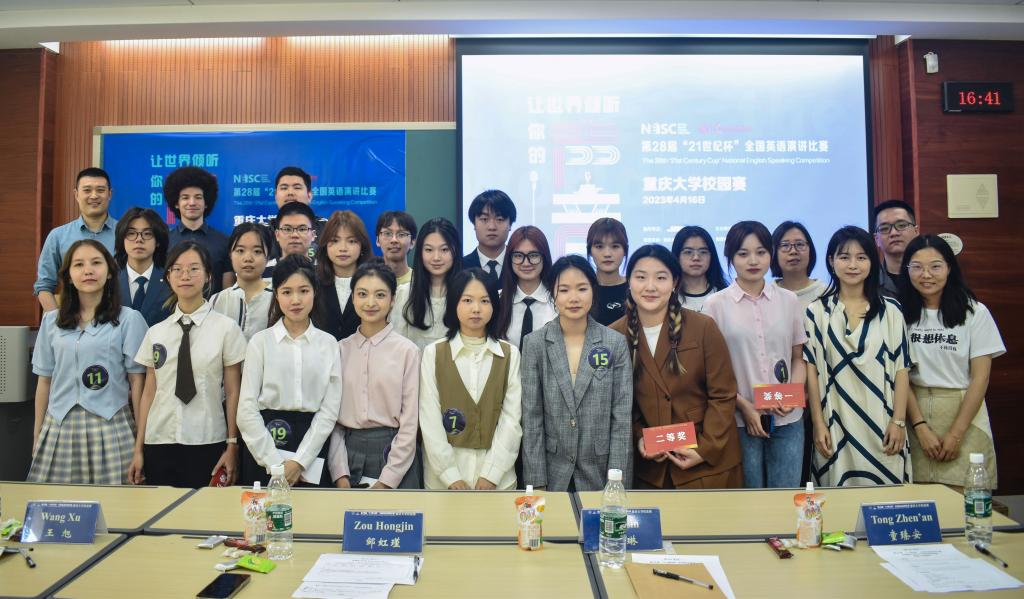 2023年4月16日,第28届“21世纪杯”全国英语演讲大赛重庆大学校选赛圆满收官。本赛事由中国日报社主办、21世纪英语教育传媒承办,赛事校选由重庆大学主办,重庆大学外国语学院承办、外语演讲与辩论协会协办,由王旭、邹虹瑾、童臻安、刘琳和Joshua Mattie-Lownes等五位老师担任评委,翁源俪同学担任现场主持人。