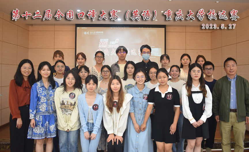 第十二届全国口译大赛(英语)重庆大学校选赛于2023年5月27日14:30在外国语学院楼501圆满落幕。校赛由重庆大学主办,重庆大学外国语学院和外语演讲与辩论协会承办,由外国语学院范定洪、邹虹瑾、陈毅强三位老师担任评审专家。赛事自启动始,吸引了来自全校14个学院20多个不同专业的学生参赛。