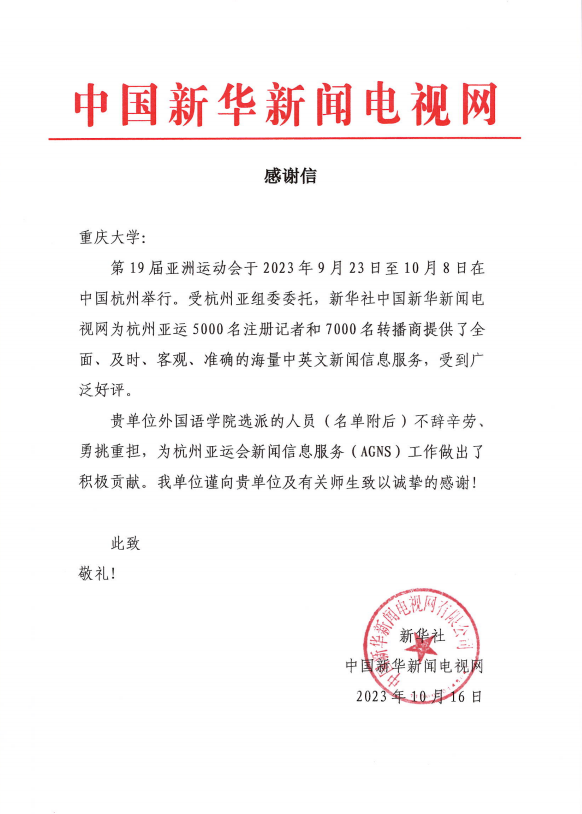 作为重庆大学外国语学院笔译专业研究生的一员,任莲洁在这次亚运会上深切体会了如何用外语讲好中国故事,她会在工作间隙向外国记者介绍中国的美食美景,听到外国友人称赞中国的现代化时,她也会心生自豪。“我很高兴这次亚运会能让更多人亲眼看见中国!” 最终,任莲洁以44篇即时引语稿的成绩收官,圆满完成任务,并收到了新华社中国新华新闻电视网发来的感谢信。