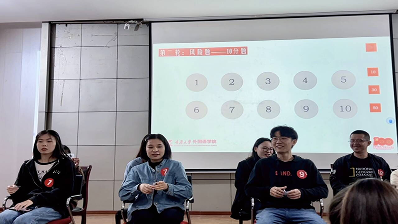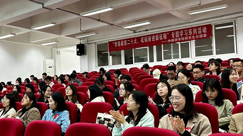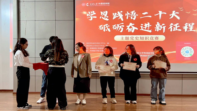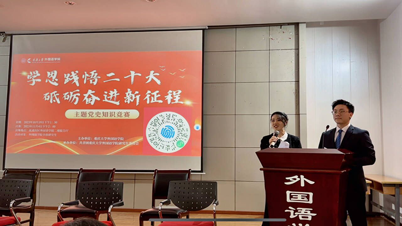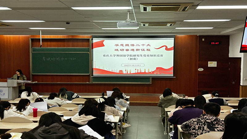 2023年11月4日下午14:00,外国语学院“学思践悟二十大,砥砺奋进新征程”主题党史知识竞赛在外国语学院多功能厅顺利举办。本次知识竞赛是重庆大学外国语学院研究生专题学习活动的重要组成部分。20名参赛选手通过初赛选拔参加此次知识竞赛,外国语学院研究生全体同学现场观赛学习。