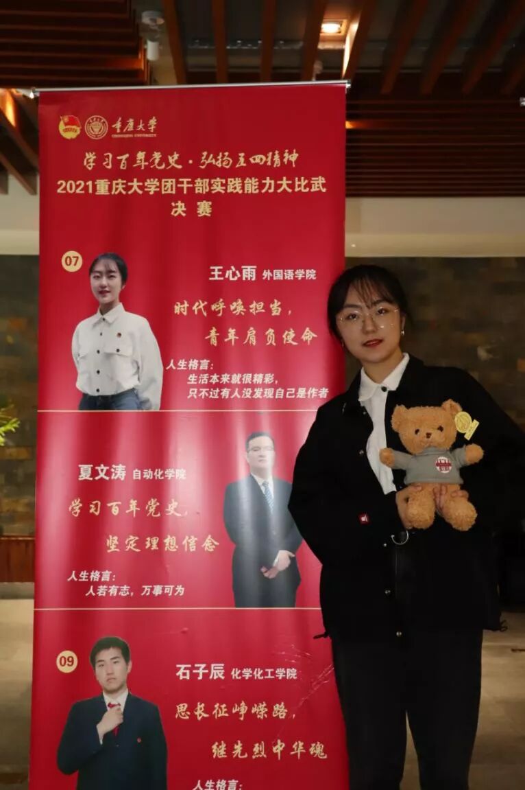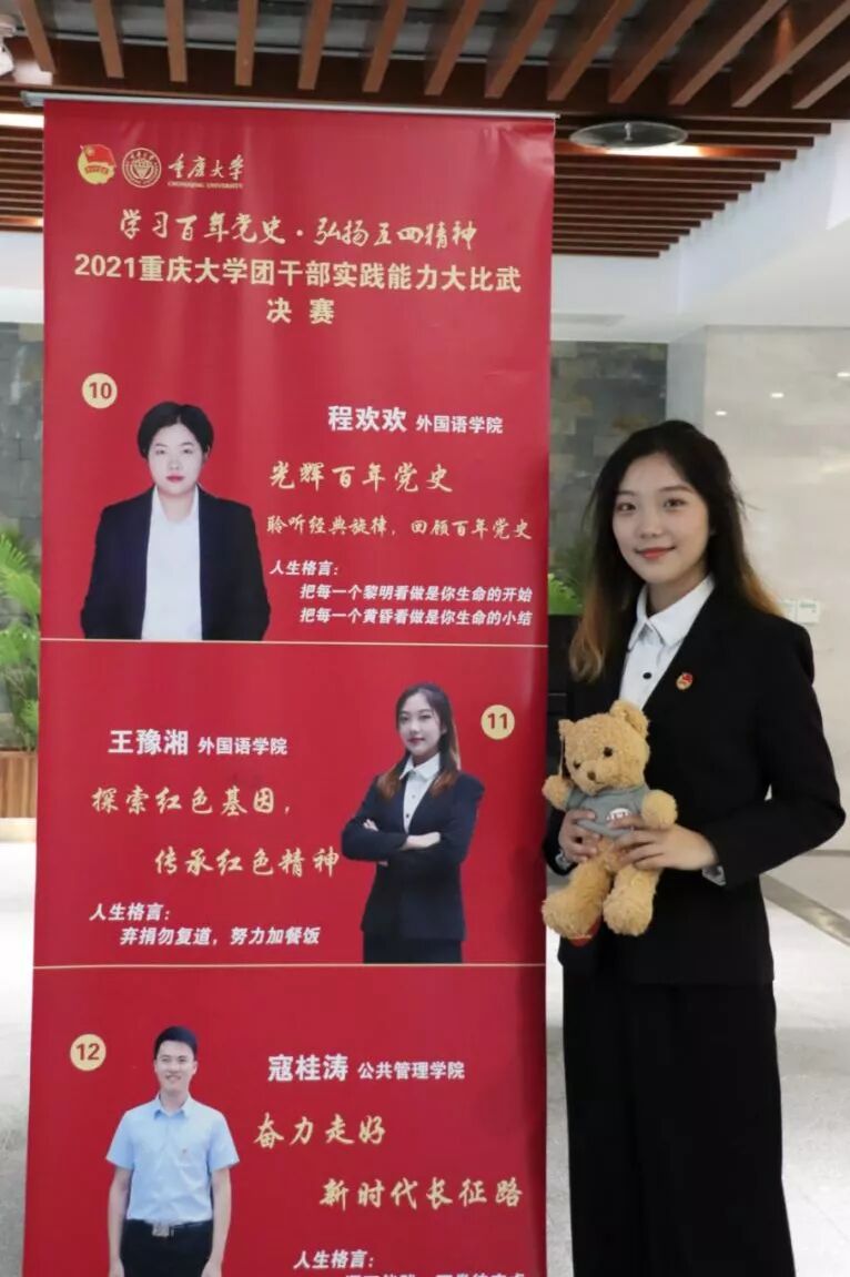 2021年4月举行的重庆大学团干部实践能力大比武活动中,我院的王豫湘,王心雨,程欢欢三名同学以优异的表现在数十位参赛选手中脱颖而出,于26日下午的决赛中,分别荣获两项三等奖,一项优秀奖,以斐然的成绩在重庆大学2021年“五四”评优表彰中获得“十佳优秀共青团干部”称号。