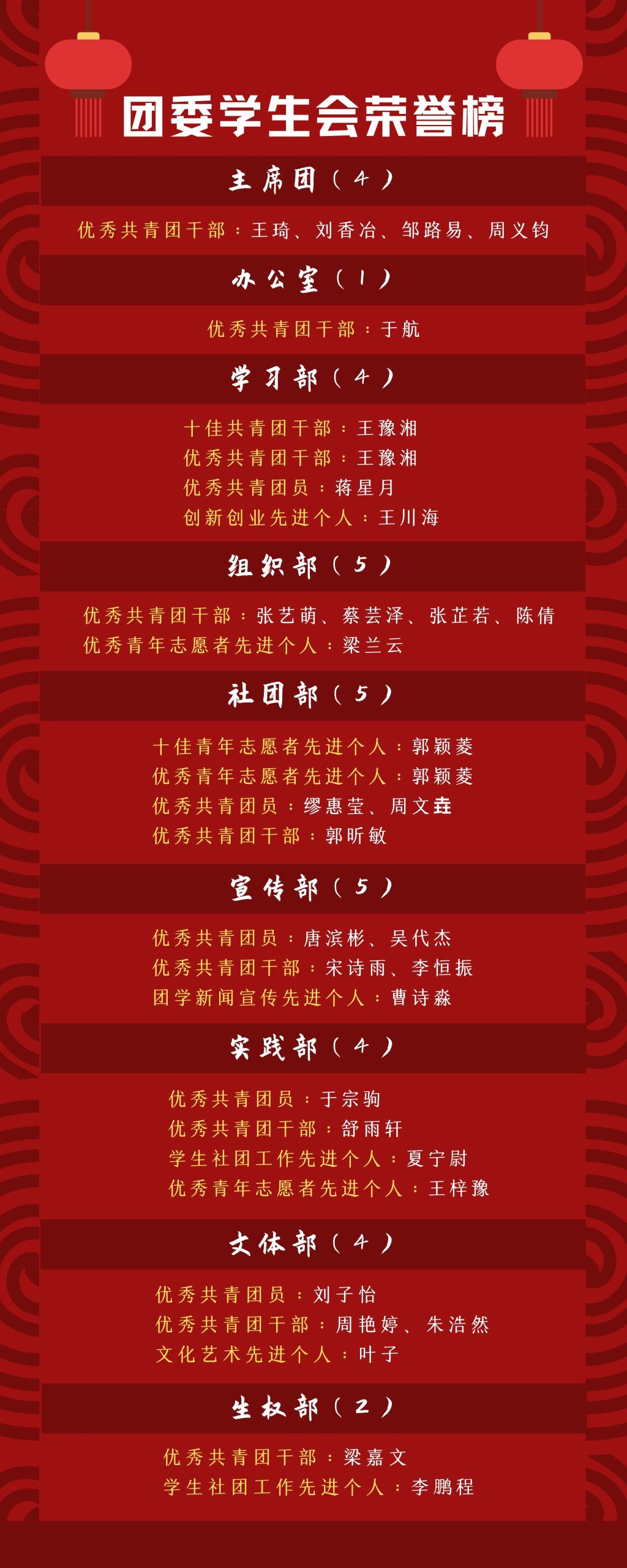 外国语学院团委学生会累计揽获34项个人荣誉,主席团4项、办公室1项、学习部4项、组织部5项、社团部5项、宣传部5项、实践部4项、文体部4项、生权部2项。