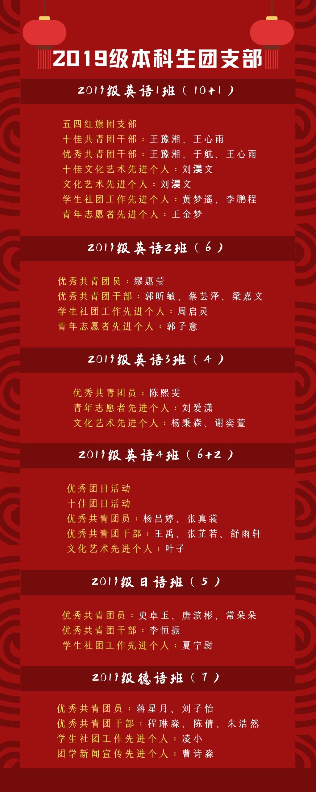 2019级本科生团支部累计获得41项荣誉。2019级英语一班团支部被评为“五四红旗团支部”,累计获得个人荣誉10项;2019级英语二班团支部获得个人荣誉6项;2019级英语三班团支部获得个人荣誉4项; 2019级英语四班团支部获得“优秀团日活动”和“十佳团日活动”2项荣誉,获得个人荣誉6项;2019级日语班团支部获得个人荣誉5项;2019级德语班团支部获得个人荣誉7项。