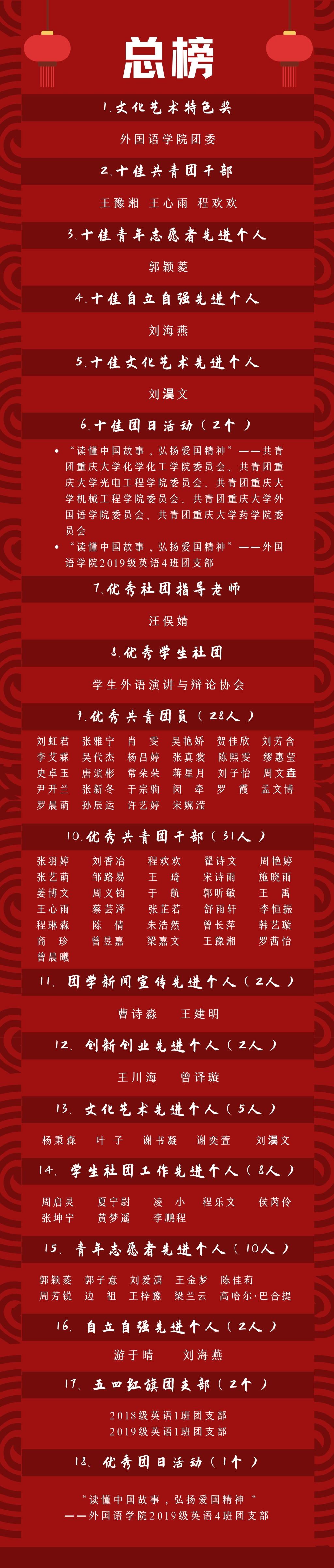 其中,外国语学院团委被授予“文化艺术特色奖”,校级A等社团外语演讲与辩论协会被评为“优秀学生社团”,团委书记汪俣婧老师获优秀社团指导老师。五四红旗团支部2个、优秀团日活动1个。“十佳”类奖项8个,十佳共青团干部3人,十佳青年志愿者先进个人、十佳自立自强先进个人和十佳文化艺术先进个人各1人,十佳团日活动2个。优秀共青团员28人、优秀共青团干部31人、团学新闻宣传先进个人2人、创新创业先进个人2人、文化艺术先进个人5人、学生社团工作先进个人8人、青年志愿者先进个人10人、自立自强先进个人2人。