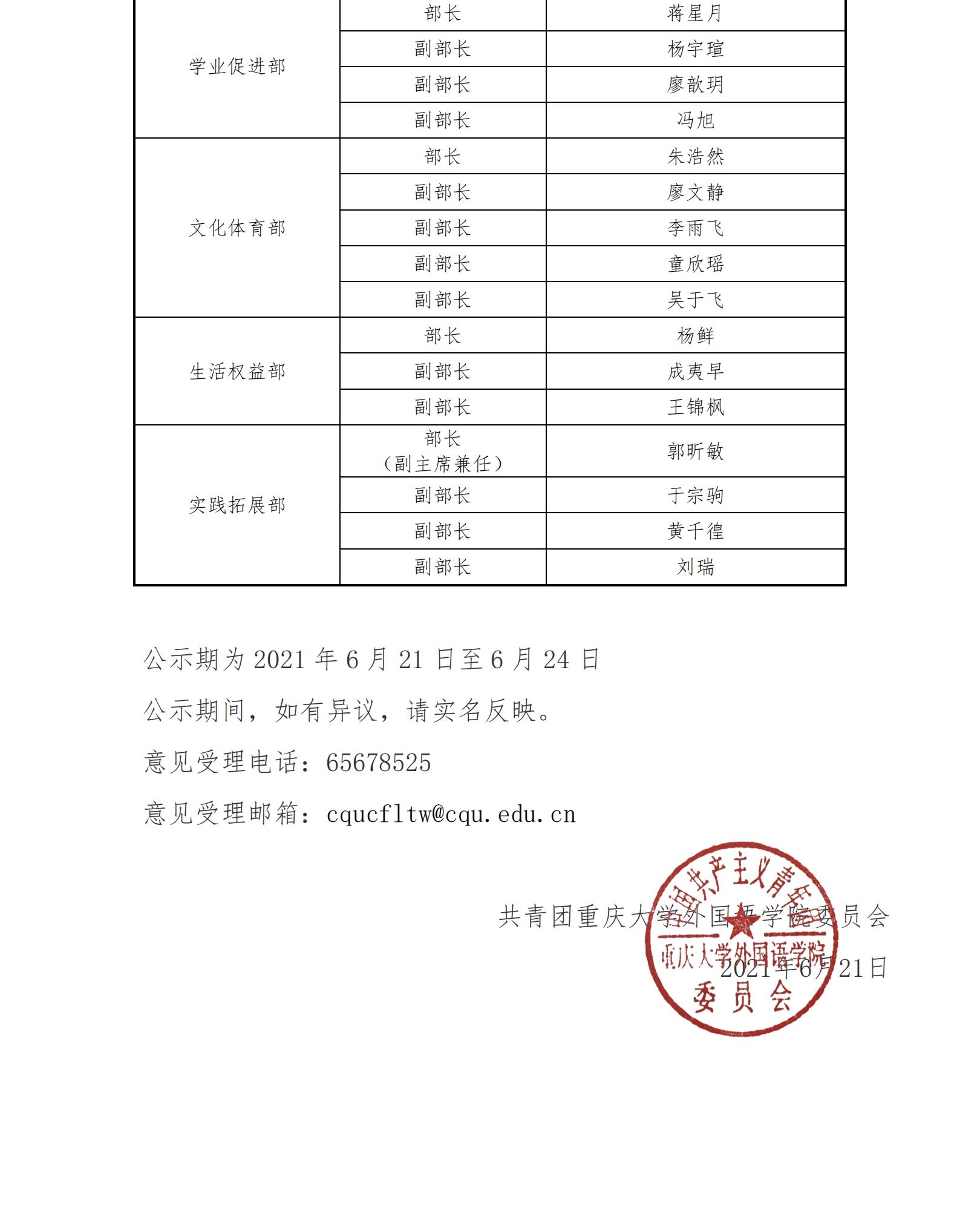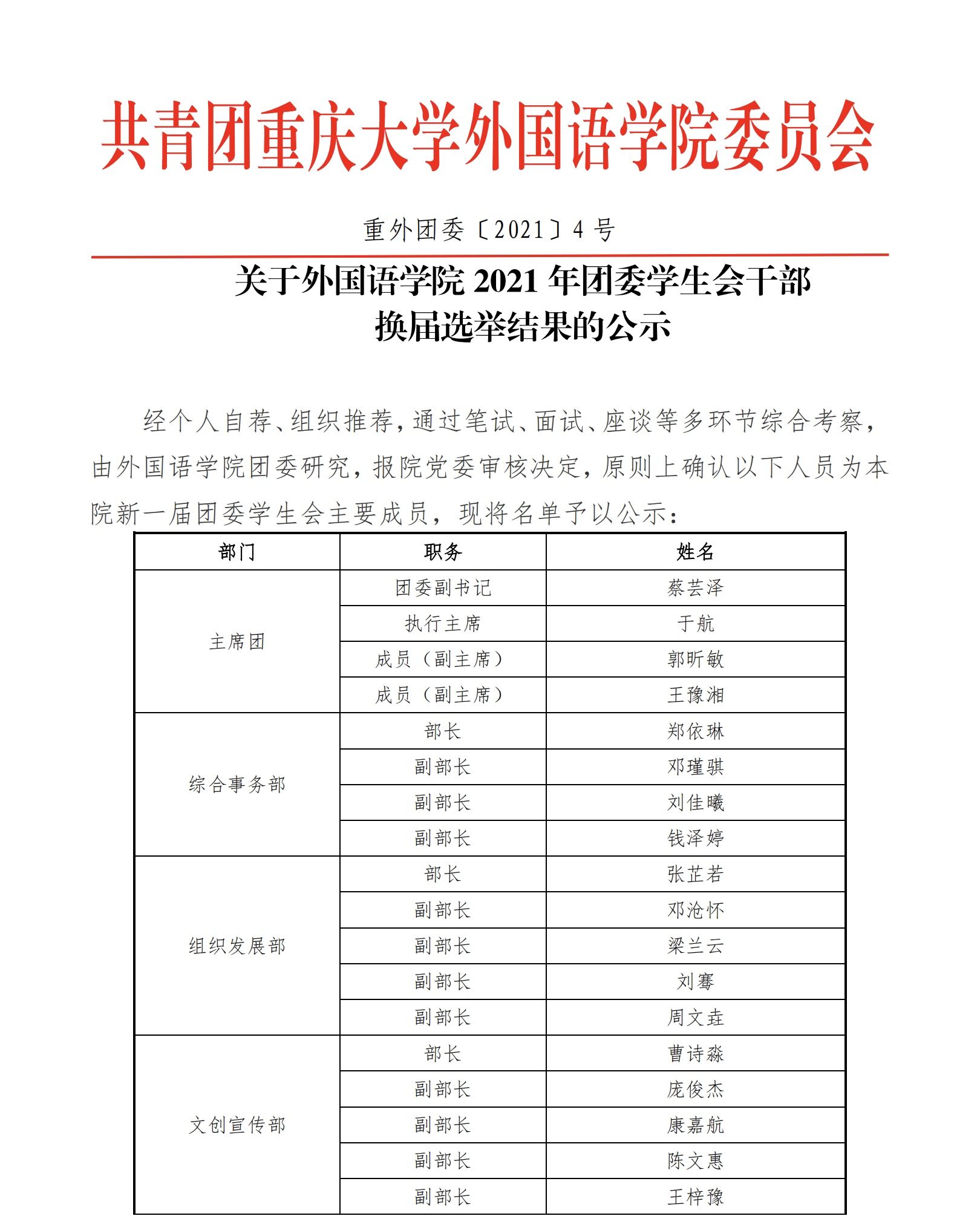关于外国语学院 2021 年团委学生会干部 换届选举结果的公示