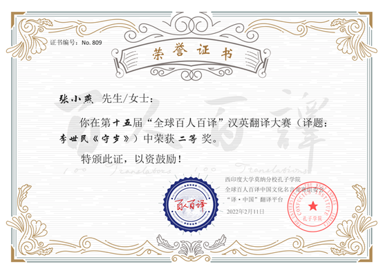 2月18日,第十五届全球“百人百译”翻译大赛评选结果揭晓,我院2021级翻译硕士张小燕同学荣获二等奖。
