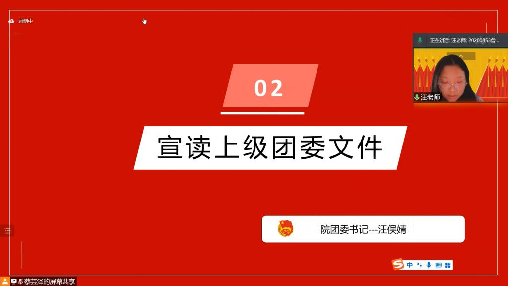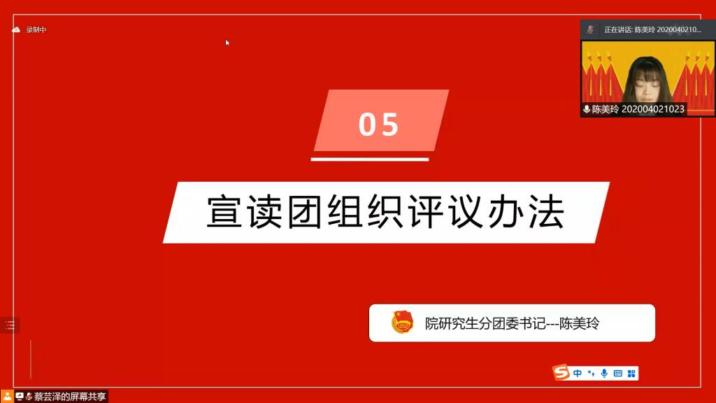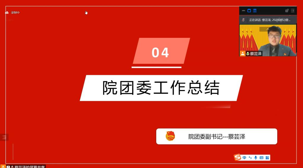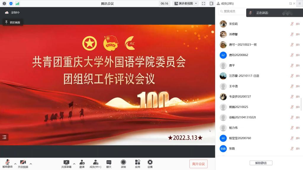 2022年3月13日下午2时30分,为贯彻落实习近平总书记关于青年工作的重要思想、严格执行“从严治团”要求、进一步完善“工作好不好,青年说了算”的评价机制,我院根据团市委文件精神及校团委通知要求,召开外国语学院团委团组织工作评议会议。由于近期疫情防控形势严峻,为保障我院师生的身体健康安全,本次会议以腾讯会议的方式于线上开展。
