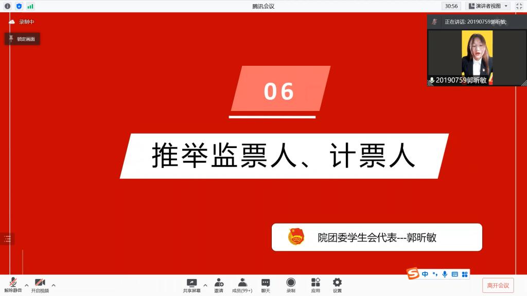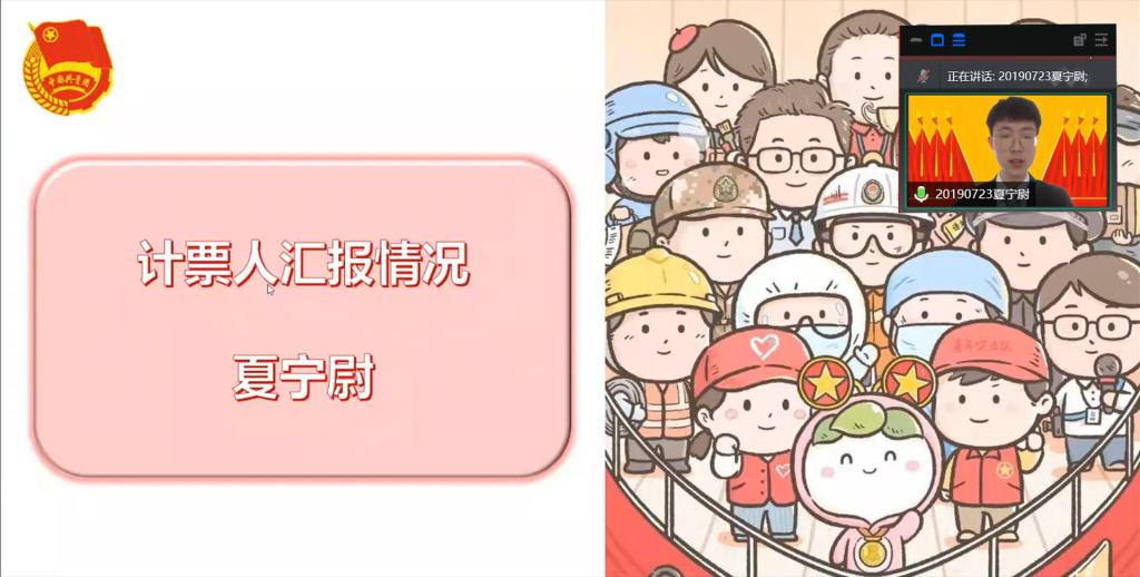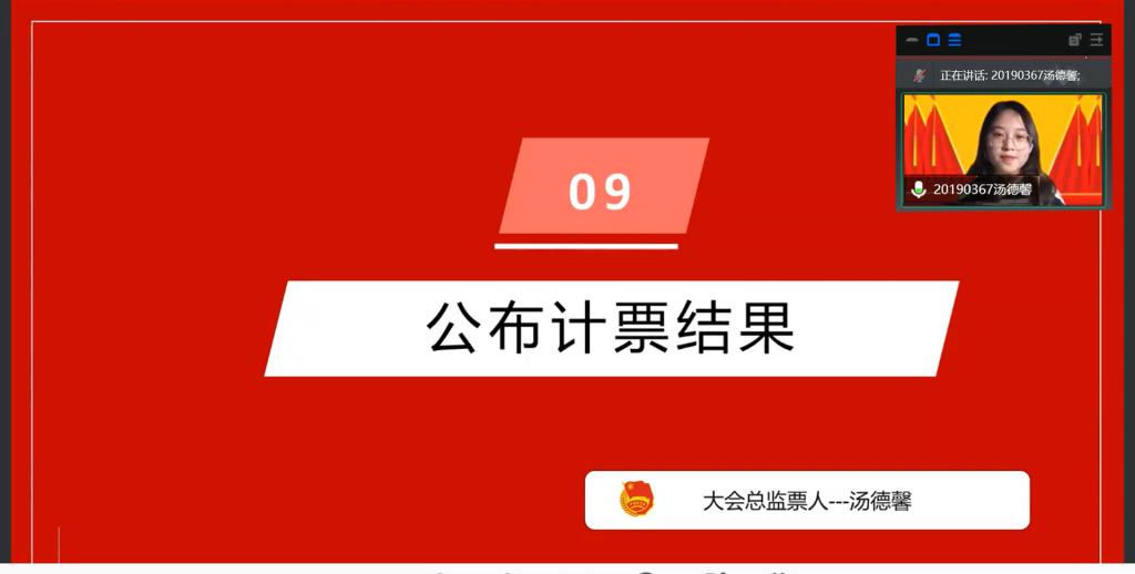 院团委研究生分团委书记陈美玲同志宣读会议评选办法,并向大会提请讨论审议。与会代表审议无误后,由院团委学生会主席团成员郭昕敏同志提名院本科生党支部代表夏宁尉同志为本次大会的计票人,测评团员代表汤德馨同志为本次大会的监票人。无异议后,会议主持人于航同志按照评议文件各项要求和精神,组织与会团员代表对外国语学院团委2021年度团组织工作进行评议。在对投票结果进行统计核查时,院团委书记汪俣婧老师、院团委副书记蔡芸泽同志分别对团务工作和团员推优入党答等内容进行详细讲解。