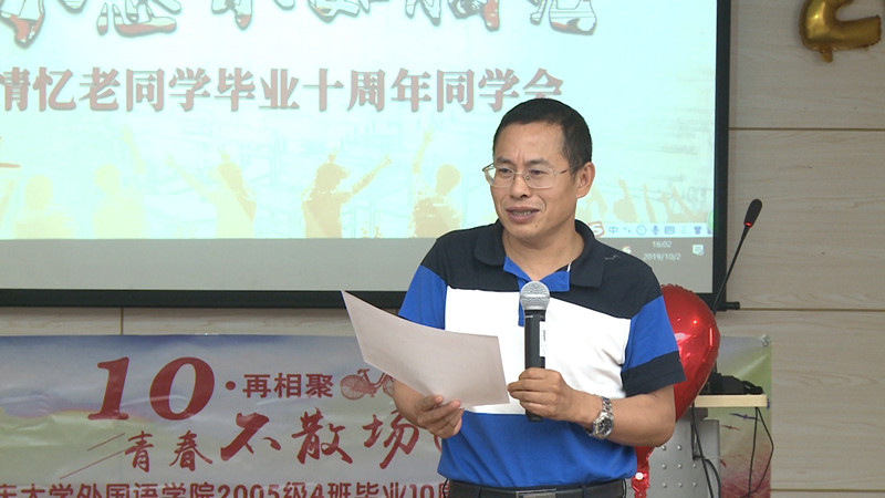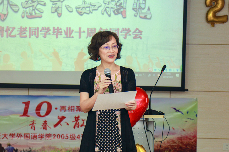彭静院长首先回望当时的教学往事及个人心得,展望未来,在外国语学院师生的共同努力下,重庆大学外语专业的发展将来愈来愈好,希望同学们一如既往支持学院的发展,关心学弟学妹们的成长。欧玲书记首先代表学校、学院热烈欢迎同学们“回家”,她翻出当年的老照片,非常动情地提及2005级是重庆大学第一批入驻虎溪校区的学生,当时校区像“工地”,周边一片荒芜,条件非常艰苦。但正因如此,这一段青春岁月却成为大家永不磨灭的记忆。曾经为担任该班《综合英语》教学的李小辉副院长自豪她曾经拥有这么开朗自信、活泼向上的一群学生,同学和老师相互影响,相互培育,共同成长。杨署东老师找来了当时的点名册,进行了一次现场的点名,并寄语同学们“你们若是安好,我的世界便是晴天。”当时作为辅导员的雷蕾老师感谢同学们丰富了她的人生,和同学们一起成长的几年让她收获了颇多。温忠义老师用自己的成长经历鼓舞同学们不忘青春的初心,牢记这一代人的使命,收获未来十年更辉煌的人生。