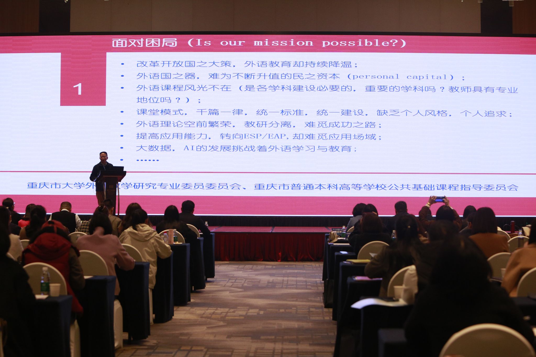 2023年11月25日,重庆市高等教育学会大学外语教学研究专业委员会 2023年年会暨大学外语教学研讨会在重庆融汇半岛酒店召开。本次大会由重庆市高等教育学会大学外语教学研究专业委员会、重庆市普通本科高等学校公共基础课程教学指导委员会联合主办,重庆邮电大学承办。重庆市教育委员会蒋云芳副主任、重庆市高等教育学会余志祥秘书长,高等教育学会大学外语教学研究专委会理事长余渭深教授以及来自全重庆市各高校的副理事长、理事及教师代表120人参加本次会议。开幕式由大学外语教学研究专委会常务副理事长、重庆大学外国语学院欧玲书记主持。会议邀请了华中科技大学徐锦芬教授、重庆大学余渭深教授做主旨发言,共同探讨智能数字发展背景下的大学外语教学改革、大学外语创新课程体系构建、外语课程思政以及外语教学研究等相关主题。