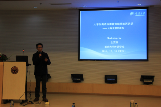 随着《大学英语教学指南》(试行稿)的出台,大学英语课程体系如何能够适应新形势的需要,如何根据各高校实际情况确定教学改革方向,如何推进大学英语教师队伍的提升等都成为各高校关注的问题。重庆市大学外语教学研究会会长、重庆大学外国语学院余渭深教授围绕着“大学生英语应用能力培养的再认识------ 大纲发展的视角”展开,指出中国大学英语教育处于转型阶段,因此我们应该对大学英语课程存在的理据、英语教学的目标、英语课程的教育价值进行重新审视,对英语应用能力进行再思考,根据国家对人才的需求、学校的人才培养目标制订校本方案,确定英语课程设置和安排,改革教学方法和模式,真正提高大学外语教学质量。