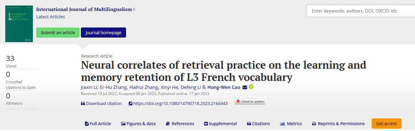 近日,我院曹洪文老师团队在英国泰勒-弗朗西斯出版集团(Taylor & Francis Group)旗下国际多语现象研究领域顶级期刊《国际多语期刊》(International Journal of Multilingualism,SSCI和A&HCI双检索,Q1)上发表题为“Neural correlates of retrieval practice on the learning and memory retention of L3 French vocabulary”的研究论文。该论文第一作者为我院语言认知与脑科学方向2020级博士生李佳欣,通讯作者为重庆大学语言认知及语言应用研究基地曹洪文教授。