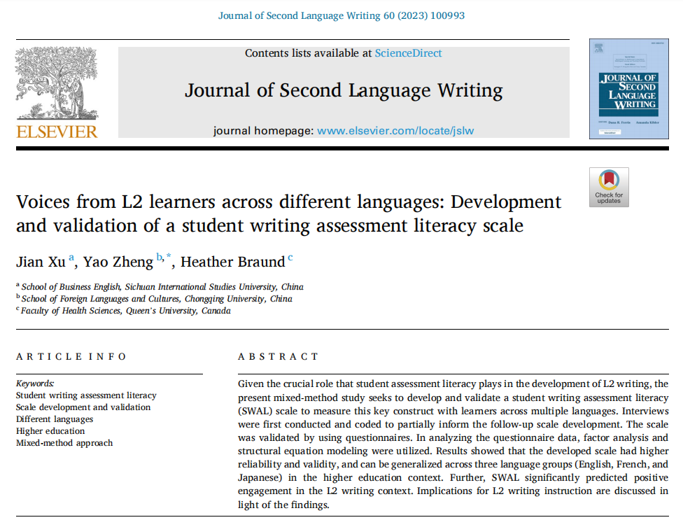 近期,我院教师郑尧博士(通讯作者)与四川外国语大学徐建博士、加拿大女王大学Heather Braund博士的合作研究成果“Voices from L2 learners across different languages: Development and validation of a student writing assessment literacy scale”在语言学期刊Journal of Second Language Writing上正式发表。该期刊为语言学顶级期刊,2021年SSCI语言学一区(影响因子5.448, JCR排名5/195)及2022年中科院期刊分区语言学一区(排名2/198)。该文是郑尧博士主持的国家社会科学基金项目“积极心理视域下中国外语学习者多语写作投入的多维度动态研究”(21CYY018)的阶段性成果。