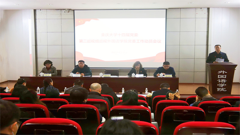 学校党委第二巡视组组长凌晓明,第二巡视组副组长周余斌及巡视组干部,外国语学院领导班子及全院教职工参加会议。
