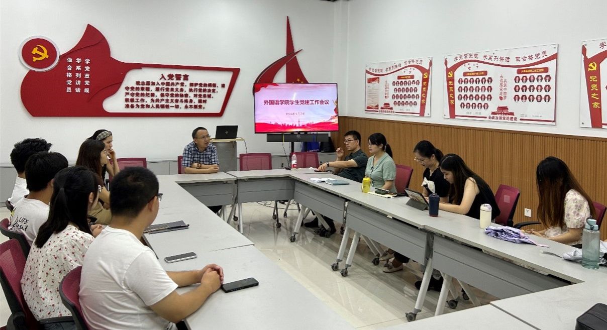 为进一步加强学生党建工作,2023年9月7日下午,外国语学院在学院楼105党员活动室召开了本年度第三次学生党建工作会议。会议由学院党委委员、组织员刘培老师主持,学院党委副书记、纪委书记魏世平老师,学院党委委员、学办主任朱洪召老师,翻硕支部书记游振声老师,汉硕支部书记杜瑾老师,本科生支部书记张茹老师,辅导员张文静老师,各学生支部书记、支委委员参加了会议。