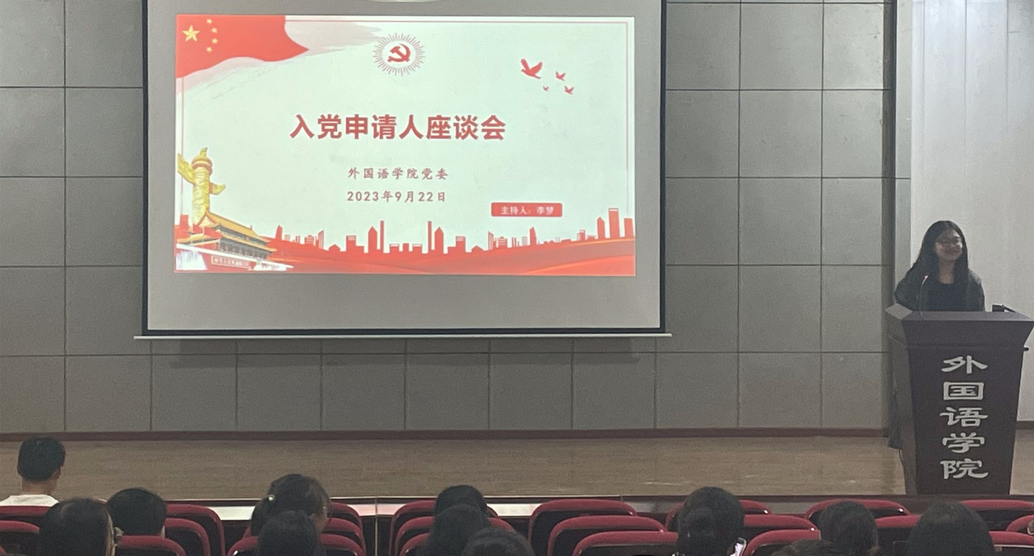 为提高我院本科、研究生2023级新生思想政治素质,加强新生与党组织的联系,外国语学院党委于2023年9月22日召开了入党申请人座谈会,全面系统地介绍了入党的流程和相关条件要求。外国语学院党委委员刘培老师、本科支部书记兼2021级辅导员张茹老师、团委书记兼本科2023级辅导员周璐老师、本科生与研究生党支部委员,以及2023级的新生入党申请人参与了本次座谈。座谈会由本科生支部李梦同志主持。