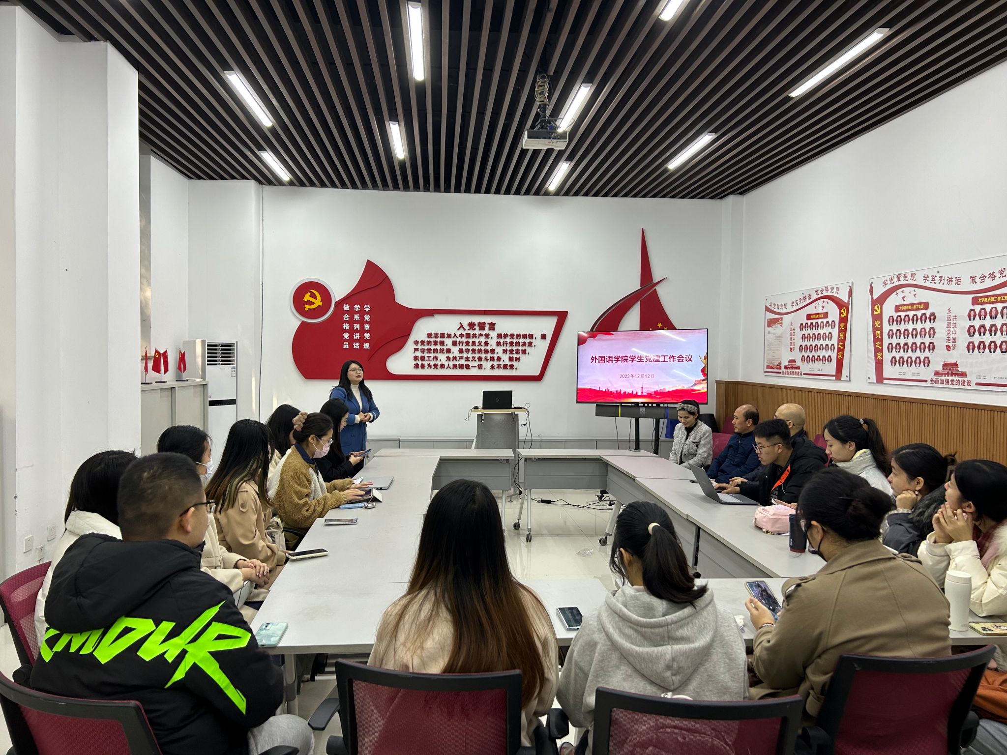 为进一步加强学生党建工作,2023年12月12日下午,外国语学院党委在学院楼105党员活动室召开了本年度第五次学生党建工作会议。会议由学院党委委员、组织员刘培老师主持,国教支部书记李良炎老师、翻硕支部书记游振声老师、本科生支部书记张茹老师、本科生支部周璐老师,各学生支部书记、支委委员参加了会议。