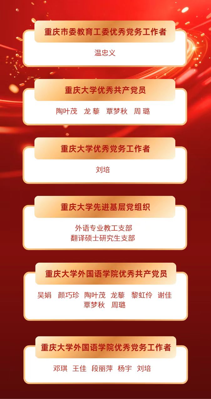 今年“七一”前夕,在中国共产党成立104年之际,外国语学院多位党员教师受到学院、学校和重庆市的表彰,党员教师争先创优、示范领航成效喜人。