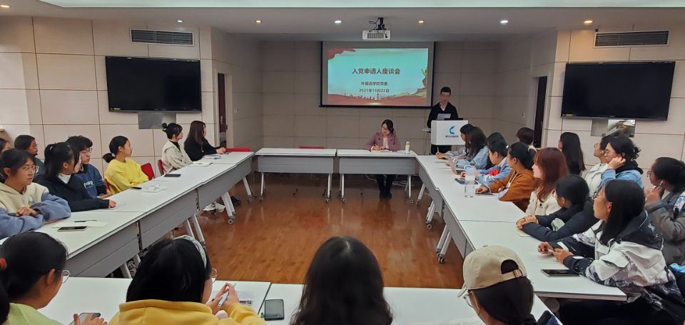 2021年10月22日下午,外国语学院党委在学院楼501报告厅召开2021级本科新生入党申请人座谈会。本次会议由本科生党支部夏宁尉同志主持,学院党委委员、正科级组织员刘培老师,本科生党支部支委委员以及2021级本科生50名入党申请人参与了座谈。