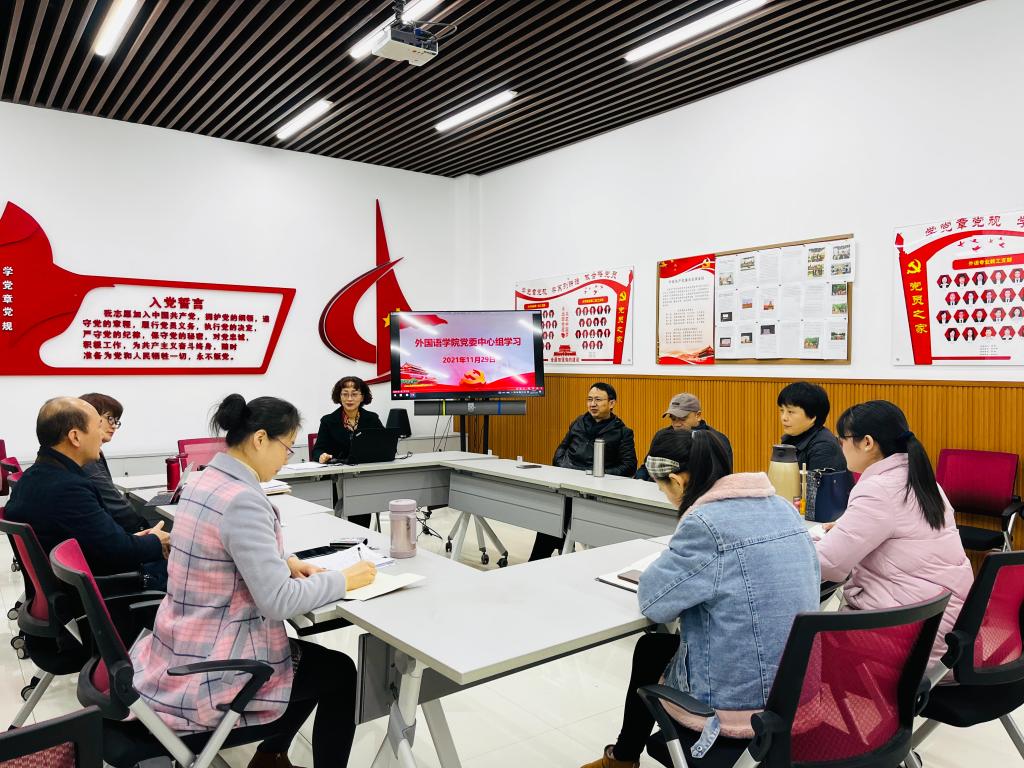 2021年11月29日中午,外国语学院党委在学院105党员活动室开展了学习活动,认真学习了十九届六中全会精神并交流了心得体会。会议由学院党委书记欧玲主持,院领导班子成员、党委委员、纪委委员参加了学习。
